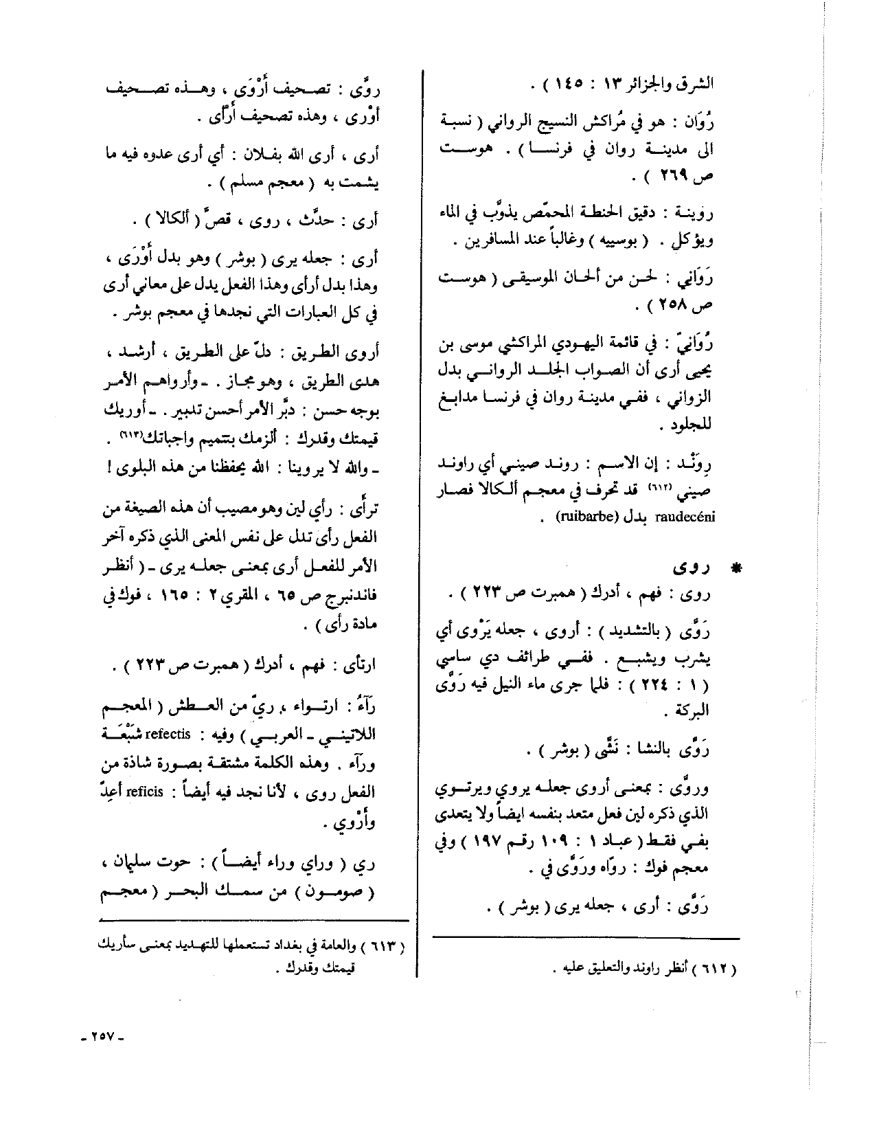 رَآءُ: راتواء، ريّ من العطش (المعجم اللاتيني - العربي) وفيه: refectis شَبْعَة ورآء. وهذه الكلمة مشتقة بصورة شاذة من الفعل روى، لأنا نجد فيه أيضاً: reficis أعِدّ وأرْوي.