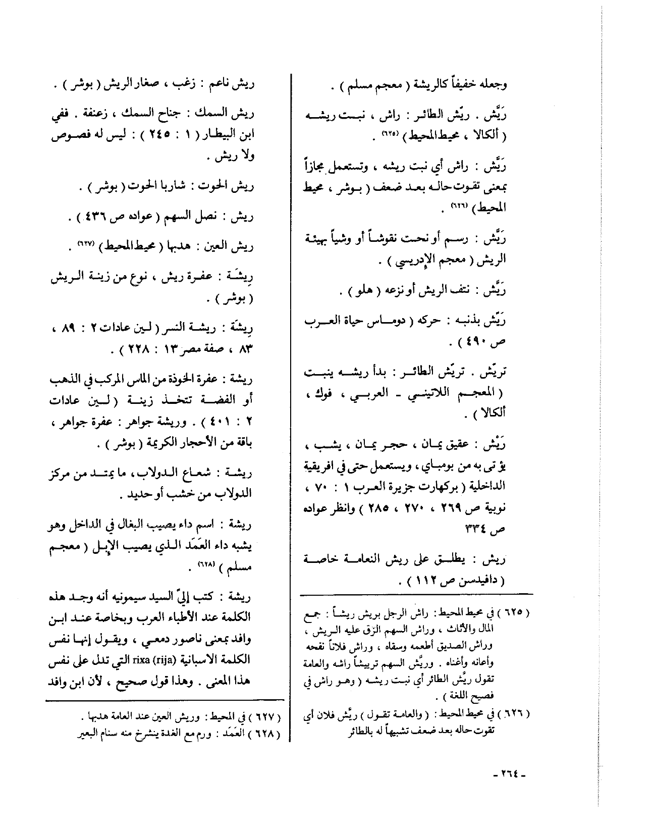 ريشة: كتب إليّ السيد سيمونيه أنه وجد هذه الكلمة عند الأطباء العرب وبخاصة عند ابن وافد بمعنى ناصور دمعي، ويقول إنها نفس الكلمة الإسبانية ( rija) rixa التي تدل على نفس هذا المعنى. وهذا قول صحيح، لأن ابن وافد
