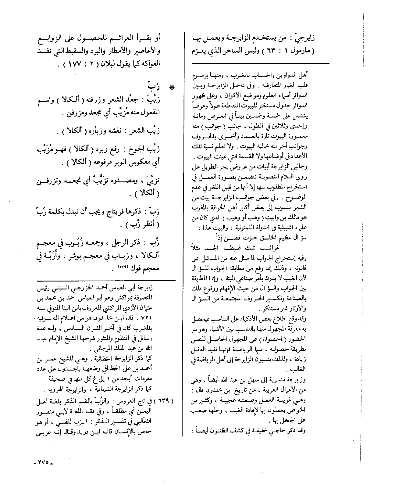 زايرجِيّ: من يستخدم الزايرجة ويعمل بها (مارمول 1: 63) وليس الساحر الذي يعزم أو يقرأ العزائم للحصول على الزوابع والأعاصير والأمطار والبرد والسقيط التي تفسد الفواكه كما يقول لبلان (2: 177).