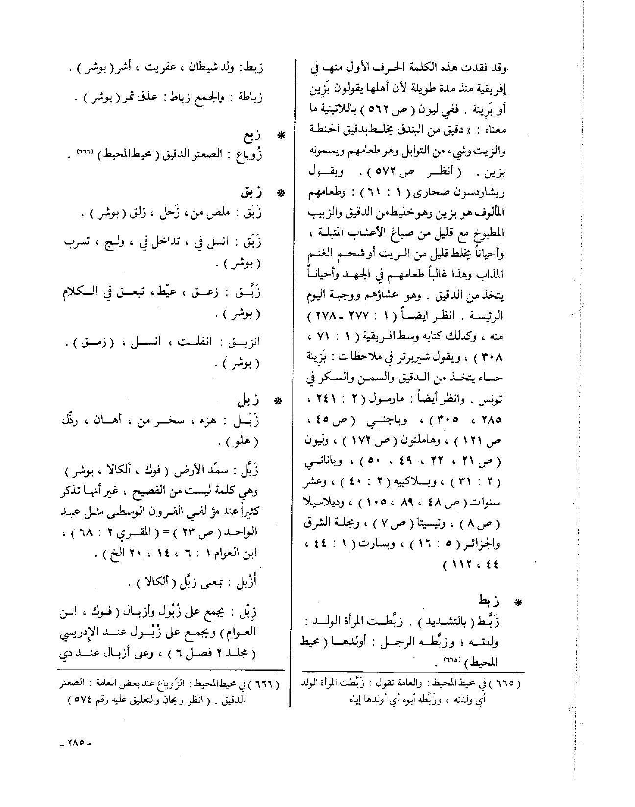 وقد فقدت هذه الكلمة الحرف الأول منها في إفريقية منذ مدة طويلة لأن أهلها يقولون بَزِين أو بَزِينة. ففي ليون (ص562) باللاتينية ما معناه: ((دقيق من البندق يخلط بدقيق الحنطة والزيت وشيء من التوابل وهو طعامهم ويسمونه بزين)) (انظر ص572). ويقول ريشاردسون صحارى (1: 61): وطعامهم المألوف هو بزين وهو خليط من الدقيق والزبيب المطبوخ مع قليل من صباغ الأعشاب المتبلة، وأحياناً يخلط قليل من الزيت أو شحم الغنم المذاب وهذا غالباً طعامهم في الجهد وأحياناً يتخذ من الدقيق، وهو عشاؤهم ووجبة اليوم الرئيسة، انظر أيضاً (1: 277 - 278) منه، وكذلك كتابه وسط إفريقية (1: 71، 308). ويقول شيربرتر في ملاحظات: بَزِينة حساء يتخذ من الدقيق والسمن والسكر في تونس. وانظر أيضاً: مارمول (2: 241، 285، 305)، وباجني (ص45، ص121)، وهاملتون (ص172)، وليون (ص21، 22، 49، 50)، وباناتي (2: 31)، وبلاكييه (2: 40)، وعشر سنوات (ص48، 89، 105)، وديلاسيلا (ص8)، وتيسيتا (ص7)، ومجلة الشرق والجزائر (: 16)، وبارت (1: 44، 112).