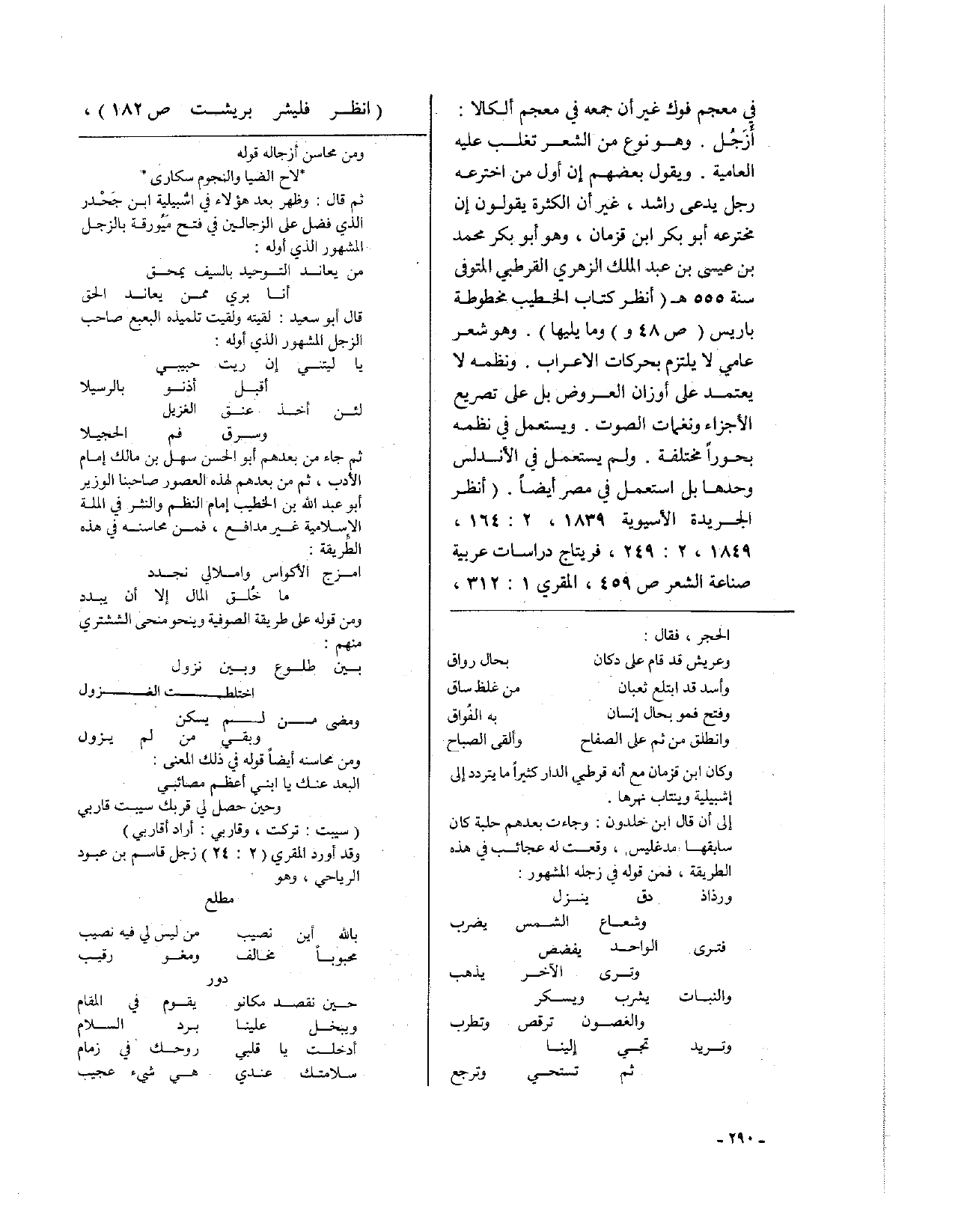في معجم فوك، غير أن جمعه في معجم ألكالا: أَزَجُل. وهو نوع من الشعر تغلب عليه العامية، ويقول بعضهم إن أول من اخترعه رجل يدعى راشد، غير أن الكثرة يقولون إن مخترعه أبو بكر ابن قزمان، وهو أبو بكر محمد بن عيسى بن عبد الملك الزهري القرطبي المتوفى سنة 555هـ (انظر كتاب الخطيب مخطوطة باريس ص48 ووما يليها). وهو شعر عامي لا يلتزم بحركات الأعراب، ونظمه لا يعتمد على أوزان العروض بل على تصريع الأجزاء ونغمات الصوت، ويستعمل في نظمه بحوراً مختلفة، ولم يستعمل في الأندلس وحدها بل استعمل في مصر أيضاً (انظر الجريدة الآسيوية 1839، 2: 164، 1849، 2: 249، فريتاج دراسات عربية صناعة الشعر ص459، المقري 1: 312، انظر فليشر بريشت ص182)،