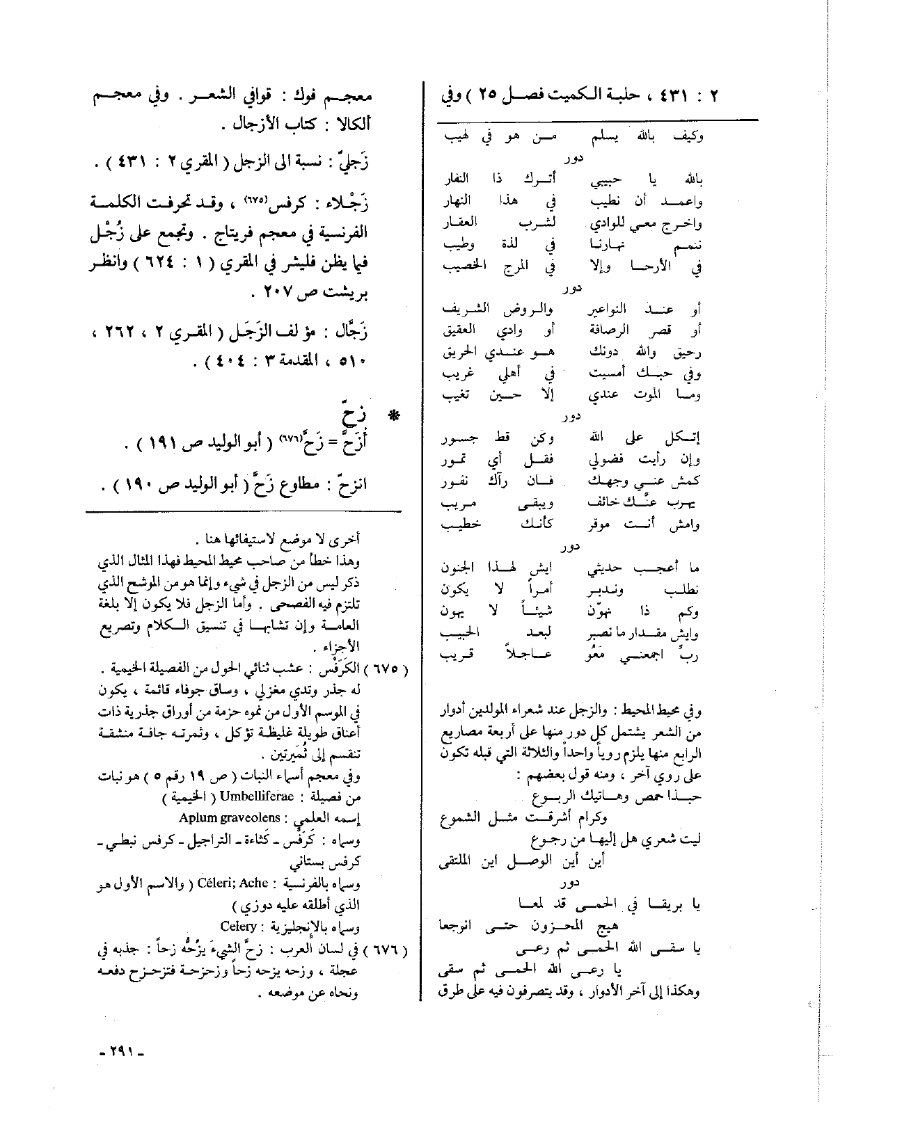 2: 431، حلبة الكميت فصل 25)، وفي معجم فوك: قوافي الشعر، وفي معجم ألكالا: كتاب الأزجال.