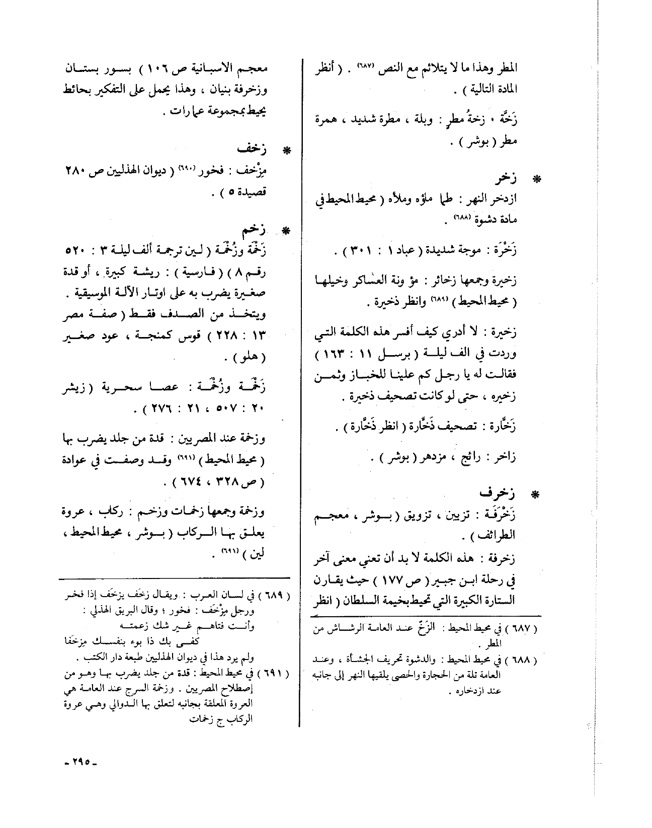 زخيرة: لا أدري كيف أفسر هذه الكلمة التي وردت في ألف ليلة (برسل 11: 163): فقالت له يا رجل كم علينا للخباز وثمن زخيره، حتى لو كانت تصحيف ذخيرة.