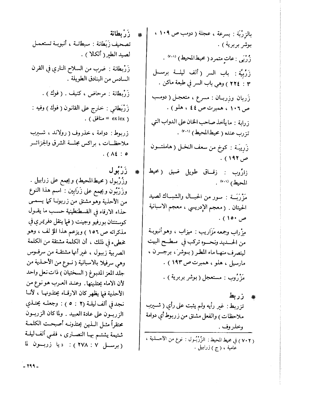 وزَرْبُون ويجمع على زَرَابِين: اسم هذا النوع من الأحذية وهو مشتق من زربونا كما يسمى حذاء الأرقاء في القسطنطينية حسب ما يقول كوستنتان بورفيو وجينت (فيما ينقل دفريمري في مذكراته ص156) ويزعم هذا المؤلف، وهو مخطئ في ذلك، أن الكلمة مشتقة من الكلمة الصربية زببول، غير أنها مشتقة من سرفوس وهي سرفيلا بالإسبانية (نوع من الأحذية من جلد المعز المدبوع (السختيان) ذات نعل واحد لأن الإماء يحتذينها). وعند العرب هو نوع من الأحذية فيما يظهر كان الأرقاء يحتذونها، لإنا نجد في ألف ليلة (2: 5): وجعله يحتذي الزربون على عادة العبيد. ولما كان الزربون محتقراً مثل الذين يحتذونه أصبحت الكلمة شتيمة يشتم بها النصارى، ففي ألف ليلة (برسل 7: 278): ((يا زربون لما