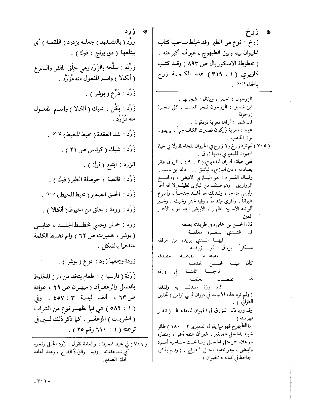 • زرخ: زرخ: نوع من الطير، وقد خلط صاحب كتاب الحيوان بينه وبين الطيهوج، غير أنه أكبر منه (مخطوطة الاسكوريال ص 893)، وقد كتب كازيري (1: 319) هذه الكلمة زرح بالحاء.