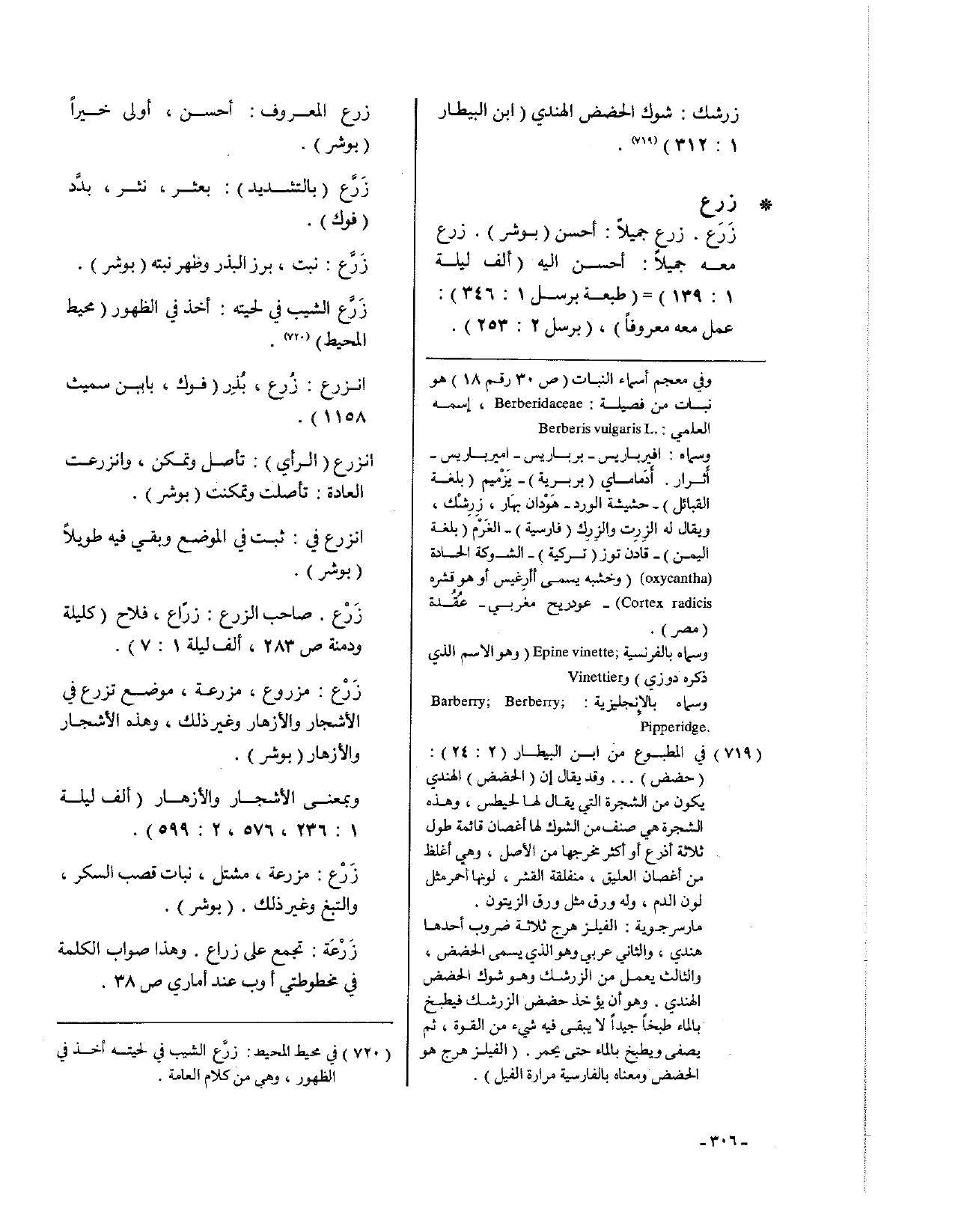 • زرع: زَرَع، زرع جميلاً: أحسن (بوشر)، زرع معه جميلاً: أحسن إليه (ألف ليلة برسل 1: 139) = (طبعة برسل 1: 346)، عمل معروفاً معه (برسل 2: 253).