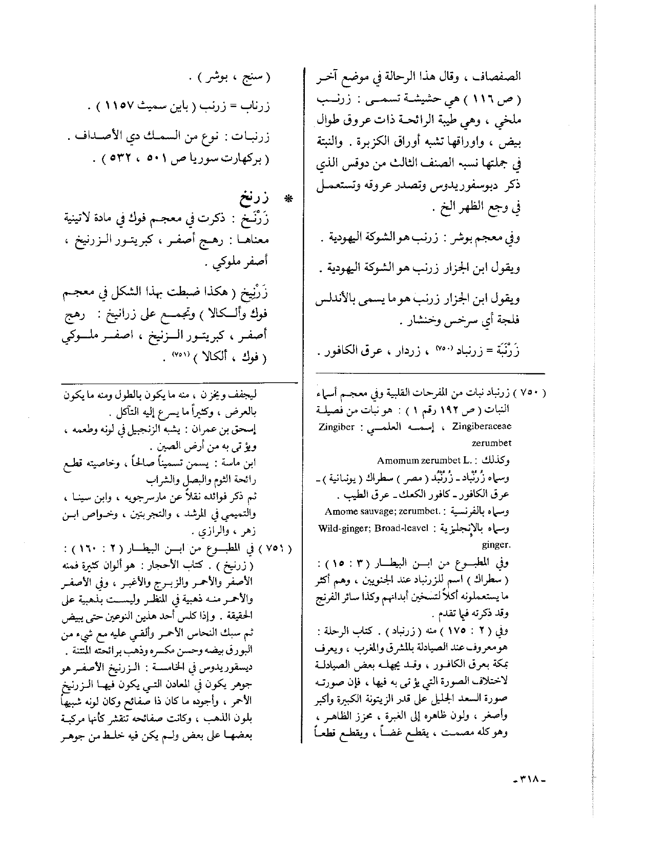 الصفصاف، وقال هذا الرحالة في موضع آخر (ص116): هي حشيشة تسمى زرنب ملخي، وهي طيبة الرائحة ذات عروق طوال بيض، وأوراقها تشبه أوراق الكزبرة. والنبتة في جملتها نسبه الصنف الثالث من دوقس الذي ذكر دبوسفوريدوس وتصدر عروقه وتستعمل فيوجع الظهر الخ.