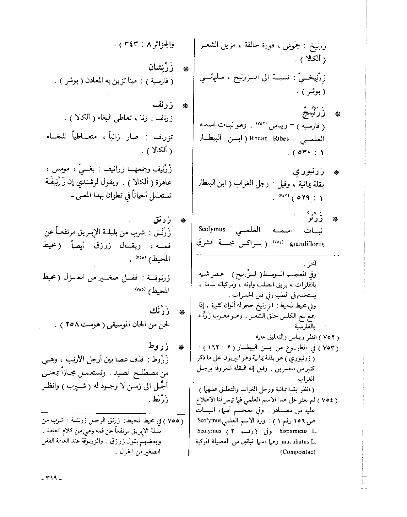 • زَرْنرْ: نبات اسمه العلمي: Scolymus grqndiflorus ( براكس مجلة الشرق والجزائر 8: 343).