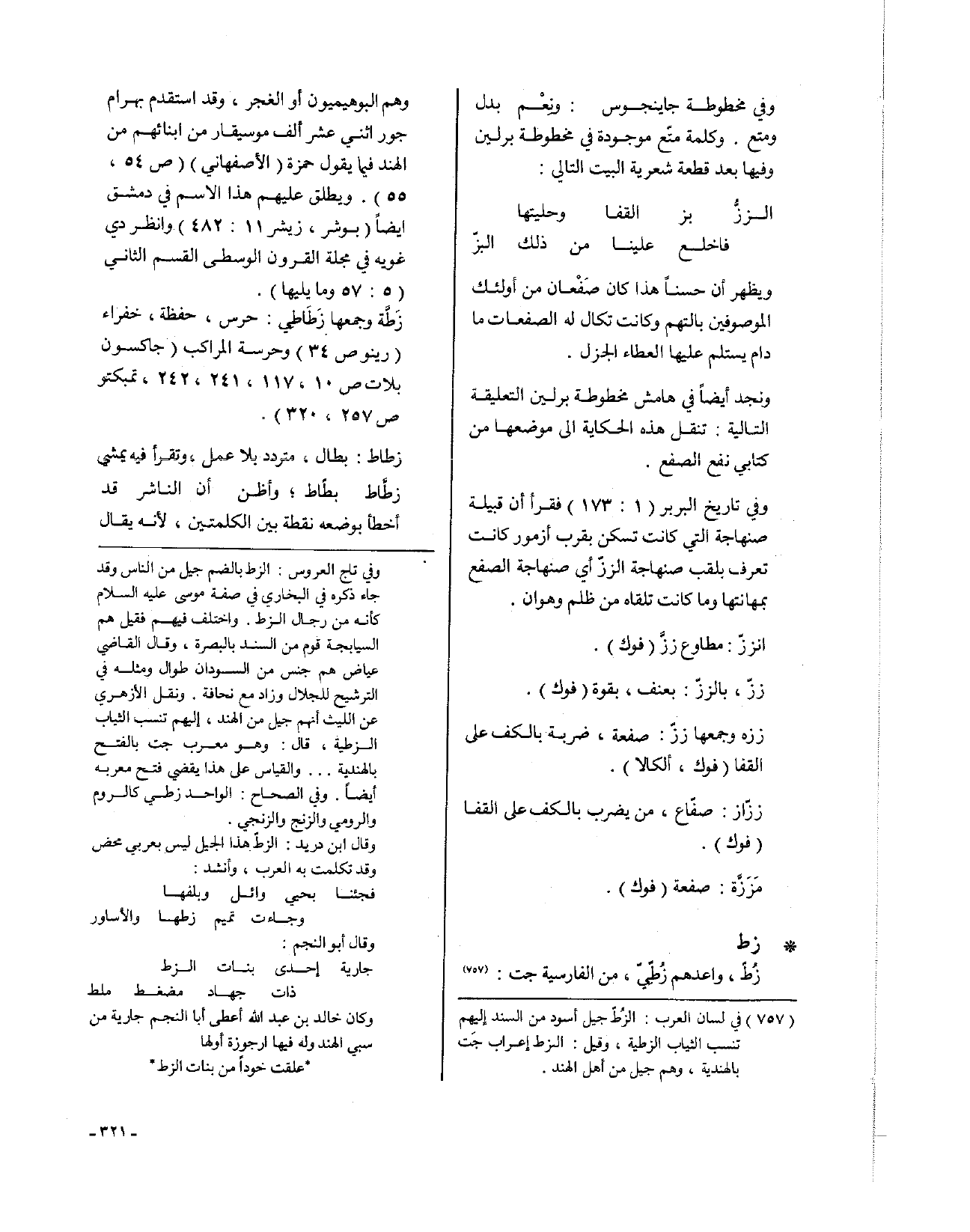• زط: زُطّ، واعدهم زُطِّيّ، من الفارسية جت: وهم البوهيميون أو الغجر، وقد استقدم بهرام جور اثني عشر ألف موسيقار من أبنائهم من الهند فيما يقول حمزة (الأصفهاني) (ص54، 55). ويطلق عليهم هذا الاسم في دمشق أيضاً (بوشر، زيشر 11: 482)، وانظر دي غويه في مجلة القرون الوسطى القسم الثاني (5: 57 وما يليها).