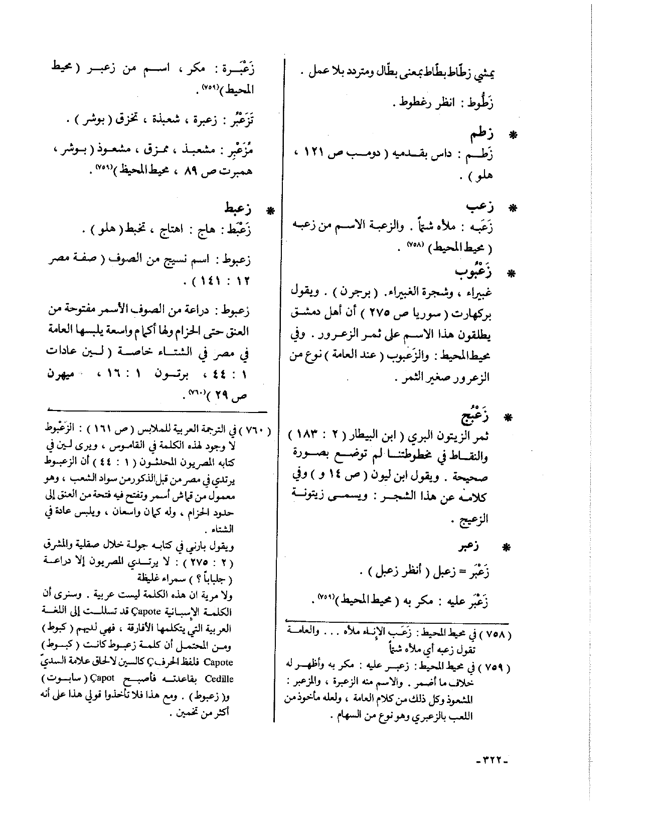 • زَعْبُج: ثمر الزيتون البري (ابن البيطار 2: 183) والنقاط في مخطوطتنا لم توضع بصورة صحيحة. ويقول ابن ليون (ص14 و) وفي كلامه عن هذا الشجر: ويسمى زيتونة الزعيج.