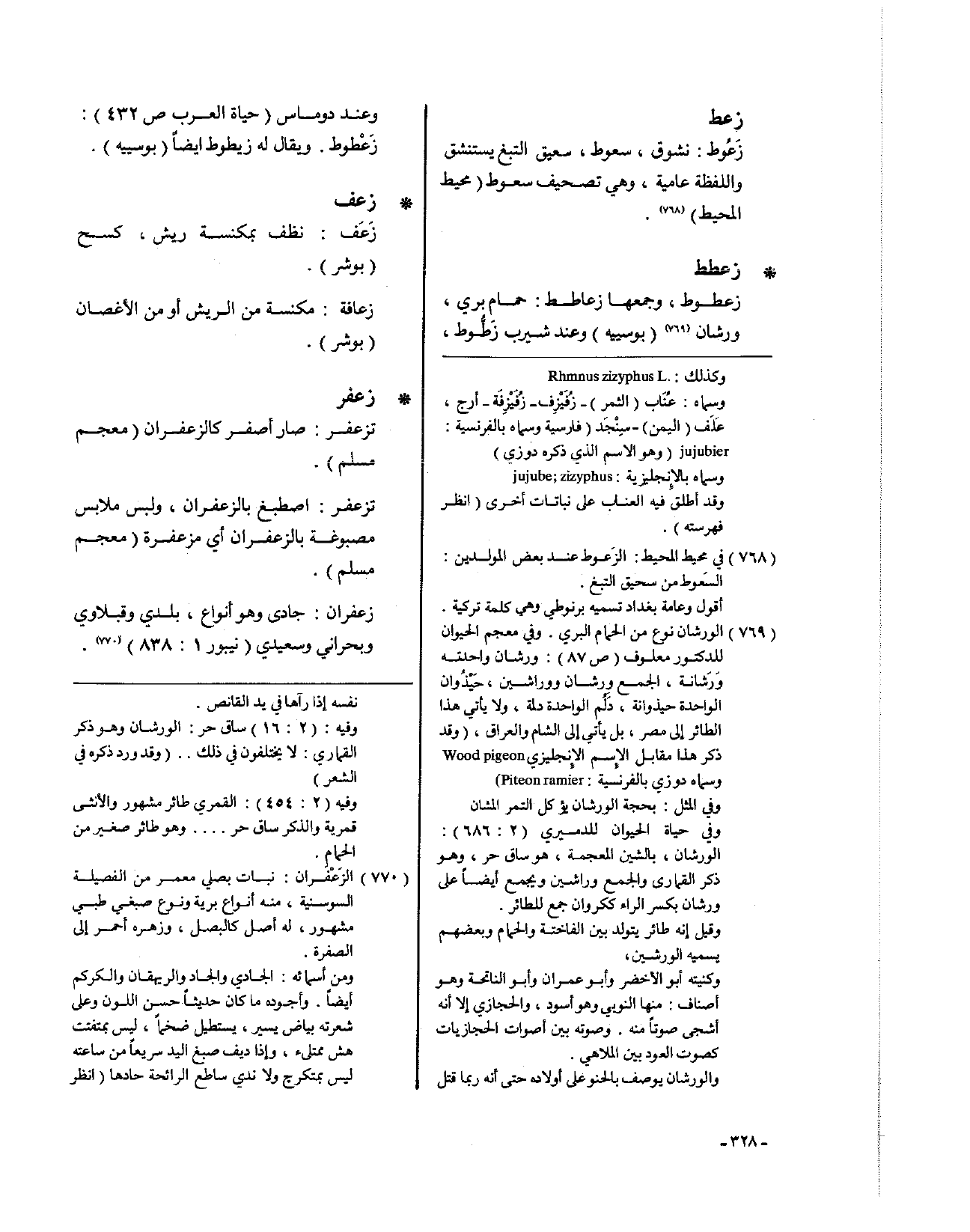 • زعطط: زعطوط، وجمعها زعاطط: حمام بري، ورشان (بوسييه)، وعند شيرب زَطُّوط، وعند دوماس (حياة العرب ص432): زَعْطوط. ويقال له زيطوط أيضاً (بوسييه).
