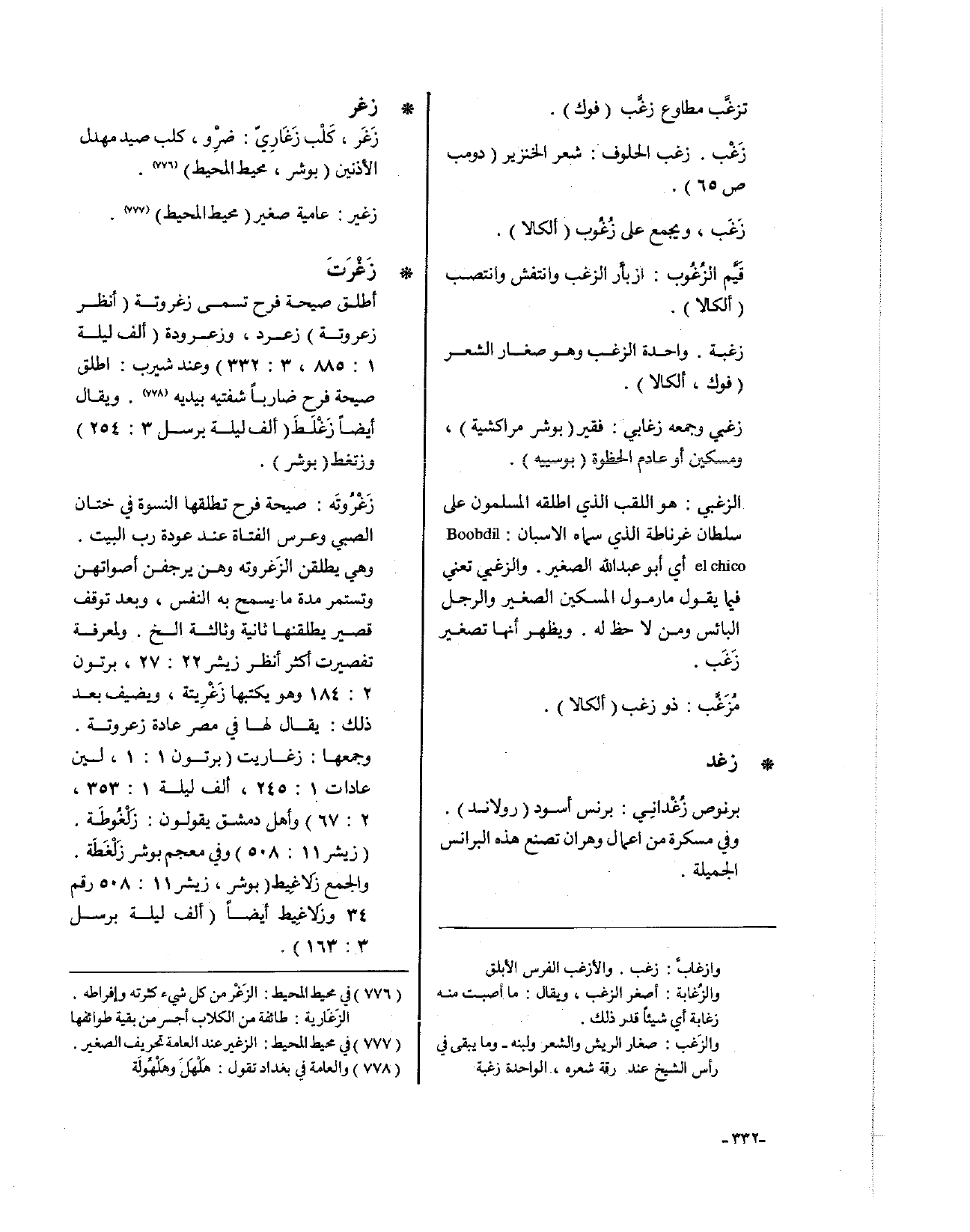• زَغْرَتَ: أطلق صيحة فرح تسمى زغروتة (انظر زغروتة)، زعرد، وزعرودة (ألف ليلة 1: 885، 3: 323)، وعند شيرب: أطلق صيحة فرح ضارباً شفتيه بيديه. ويقال أيضاً زَغْلَطَ (ألف ليلة برسل 3: 254؟)، وزتغط (بوشر). زَغْرُوتَه: صيحة فرح تطلقها النسوة في ختان الصبي وعرس الفتاة عند عودة رب البيت. وهي يطلقن الزَغروته وهن يرجفن أصواتهن وتستمر مدة ما يسمح به النفس، وبعد توقف قصير يطلقنها ثانية وثالثة الخ. ولمعرفة تفصيلات أكثر انظر (زيشر 22: 27، برتون 2: 184 وهو يكتبها زَغْرِيتة، ويضيف بعد ذلك: يقال لها في مصر عادة زعروته). وجمعها: زغاريت (برتون 1: 1، لين عادات 1: 245، ألف ليلة 1: 353، 2: 67)، وأهل دمشق يقولون: زَلْغُوطَة (زيشر 11: 508). وفي معجم بوشر: زَلْغَطَة، والجمع زَلاغِيط (بوشر، زيشر 11: 508 رقم 34) وزَلاغِيط أيضاً (ألف ليلة برسل 3: 163).