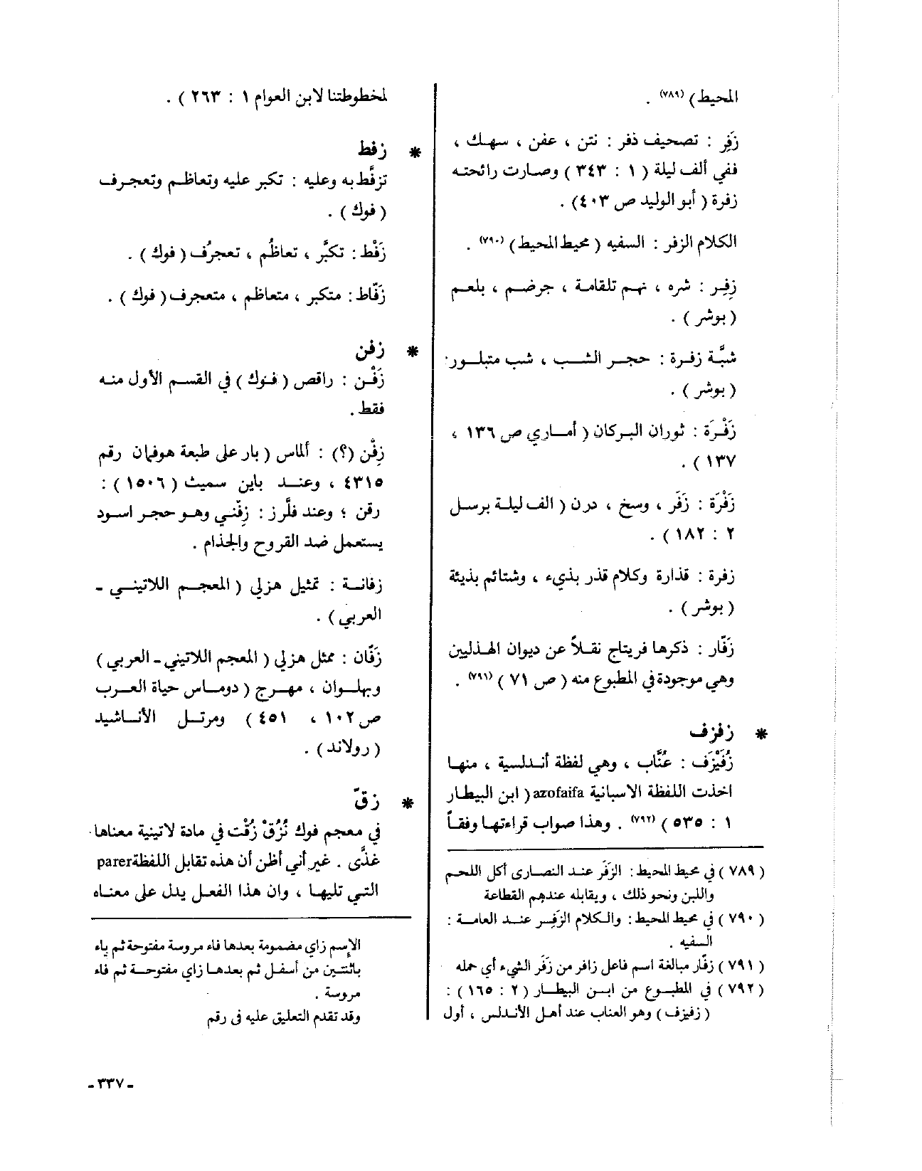 • زفزف: زُفَيْزَف: عُنَّاب، وهي لفظة أندلسية، منها أخذت اللفظة الإسبانية azofaifa ( ابن البيطار 1: 535). وهذا صواب قراءتها وفقاً لمخطوطتنا لابن العوام (1: 263).