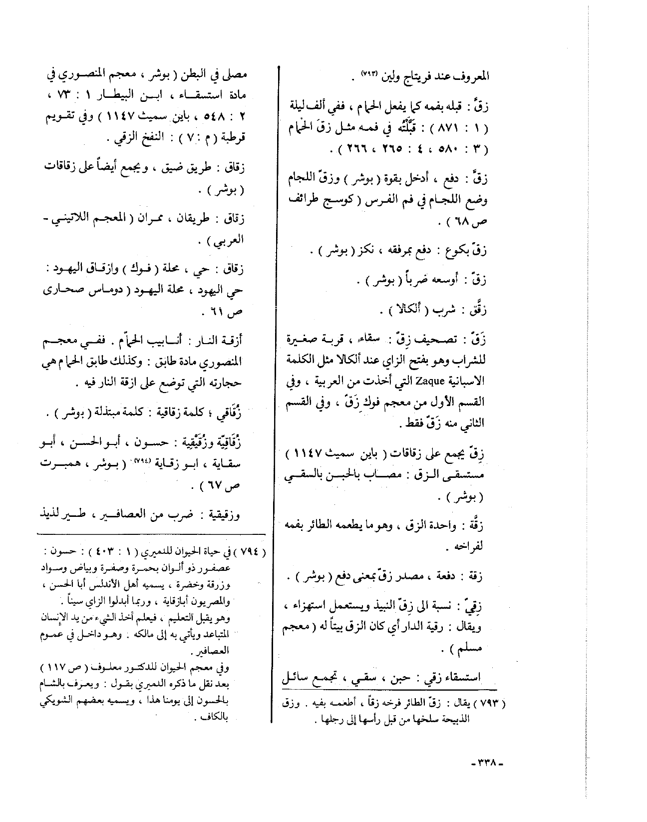 زقَّ: قبله بفمه كما يفعل الحمام، ففي ألف ليلة (1: 871): قَبَّلْتُه في فمه مثل زقّ الحمام (3: 580، 4: 265، 266).