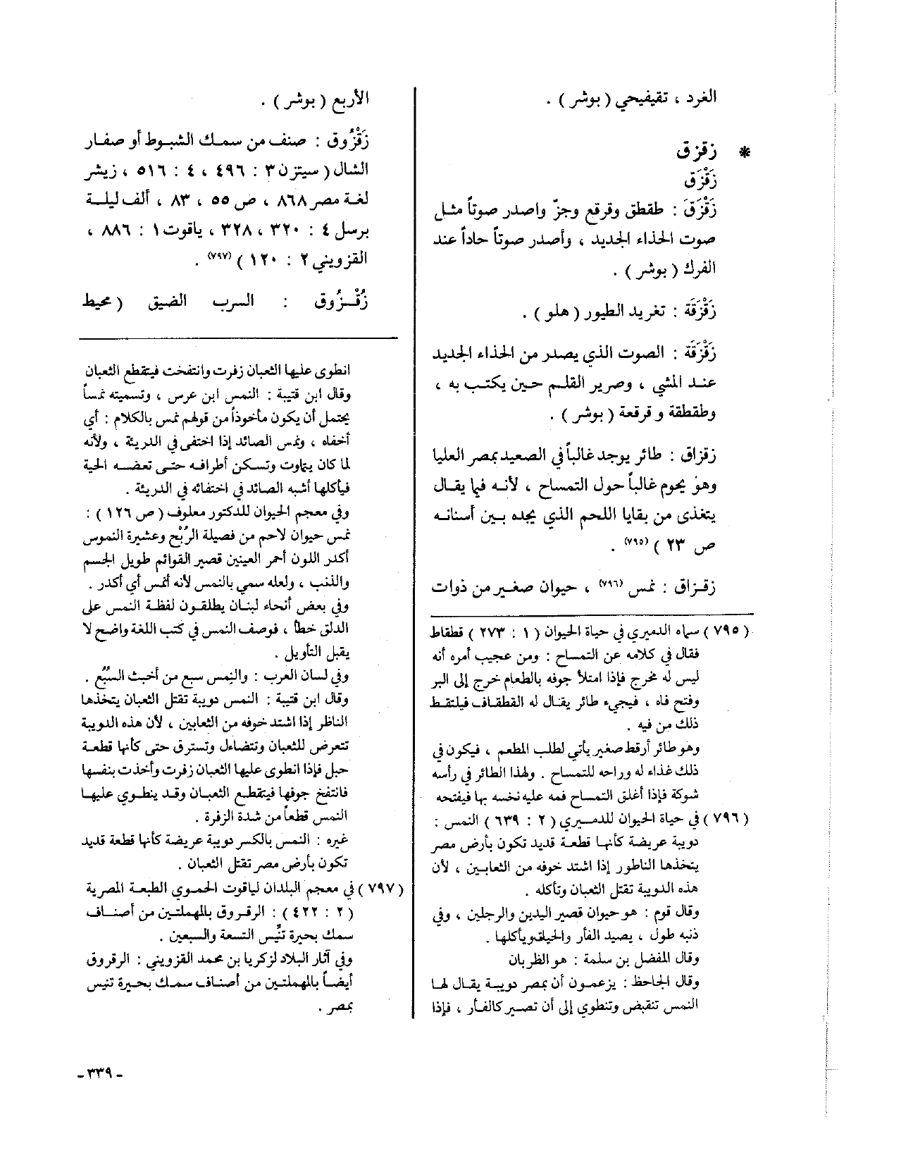 زقزاق: طائر يوجد غالباً في الصعيد بمصر العلب\يا وهو يحوم غالباً حول التمساح، لأنه فيما يقال يتغذى من بقايا اللحم الذي يجده بين أسنانه (ص23).