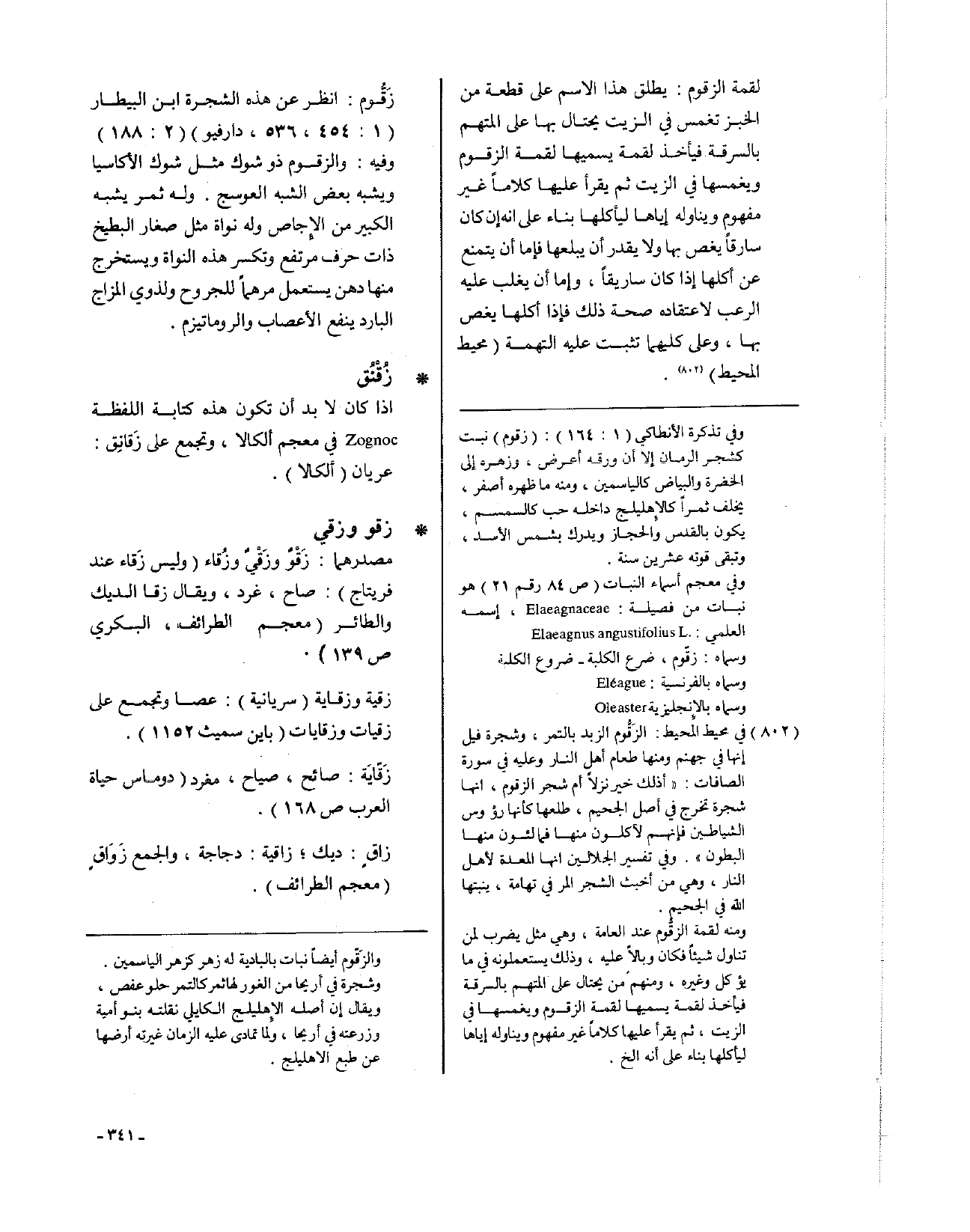 زَقٌّوم: انظر عن هذه الشجرة ابن البيطار (1: 454، 536، دارفيو) (2: 188)، وفيه: والزقوم ذو شوك مثل شوك الأكاسيا ويشبه بعض الشبه العوسج، وله ثمر يشبه الكبير من الأجاص وله نواة مثل صغار البطيخ ذات حرف مرتفع وتكسر هذه النواة ويستخرج منها دهن يستعمل مرهماً للجروح ولذوي المزاج البارد ينفع الأعصاب والروماتيزم.