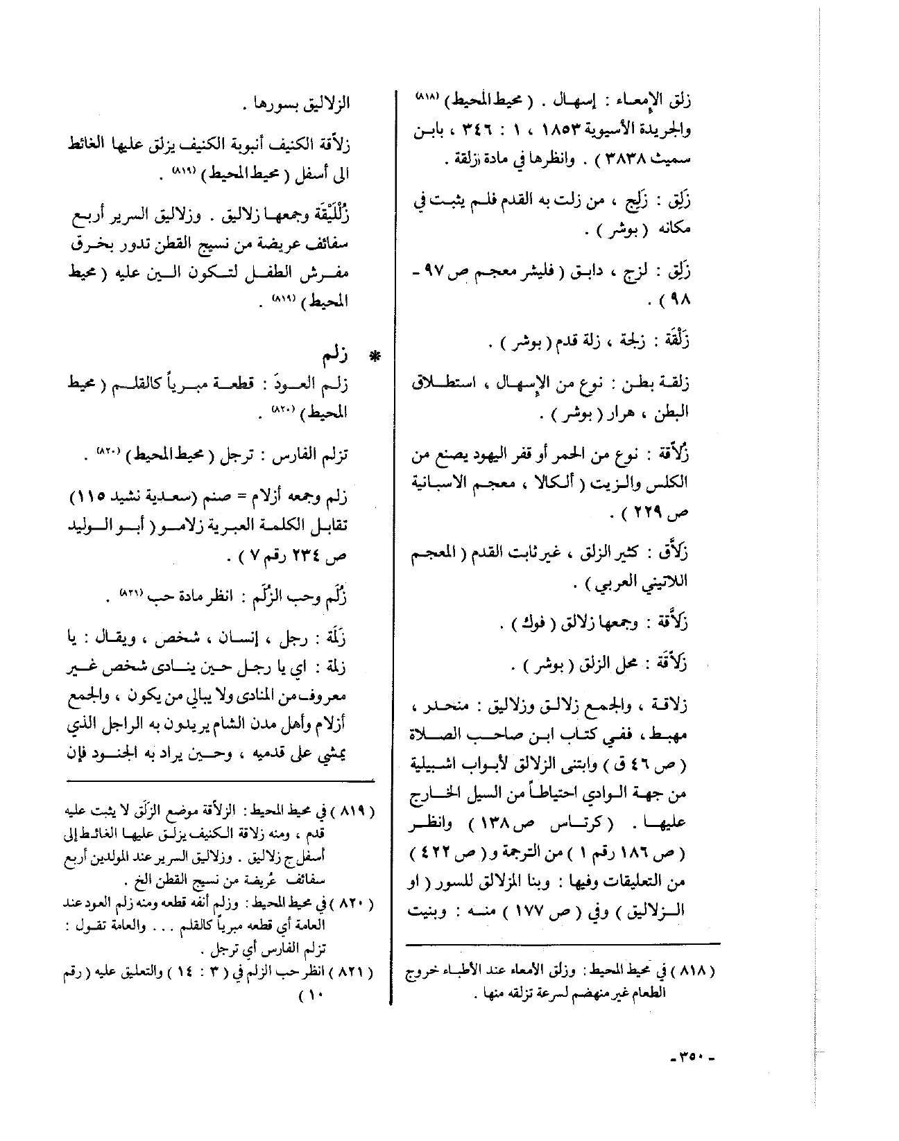 زلاقة، والجمع زلالق وزلاليق: منحدر، مهبط، ففي كتاب ابن صاحب الصلاة (ص46 ق): وابتنى الزلالق لأبواب إشبيلية من جهة الوادي احتياطاً من السيل الخارج عليها (كرتاس ص 138)، وانظر (ص186 رقم 1) من الترجمة و (ص422) من التعليقات وفيها: وبنا المزلالق للسور (أو الزلاليق)، وفي (ص177) منه: وبنيت الزلاليق بسورها.