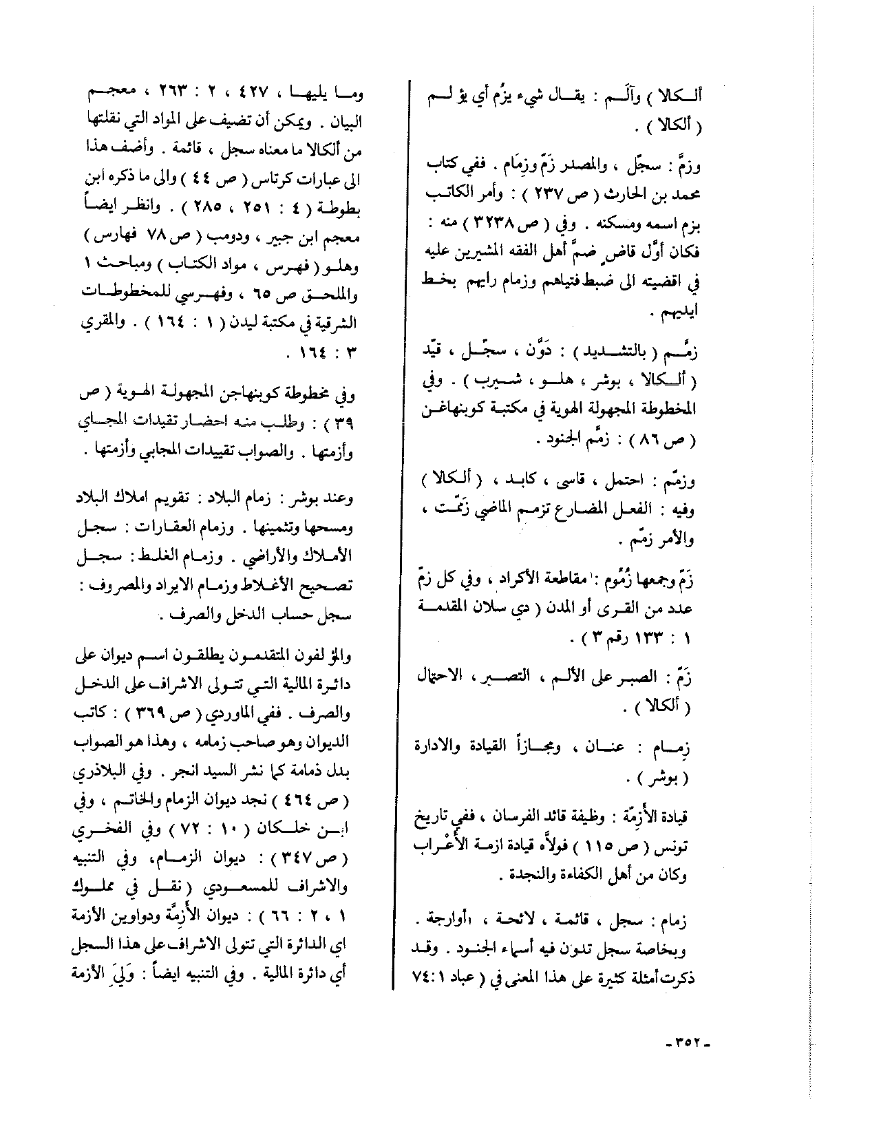 زمام: سجل، قائمة، لائحة، وأوارجة، وبخاصة سجل تدون فيه أسماء الجنود. وقد ذكرت أمثلة كثيرة على هذا المعنى في (عباد 1: 74 وما يليها، 427، 2: 263، معجم البيان)، ويمكن أن تضيف على المواد التي نقلتها من ألكالا ما معناه سجل، قائمة. وأضف هذا إلى عبارات كرتاس (ص44) وإلى ما ذكره ابن بطوطة (4: 251، 285)، وانظر أيضاً معجم ابن جبير، ودومب (ص78 فهارس)، وهلو (فهرس، مواد الكتاب) ومباحث (1) والملحق (ص65)، وفهرسي للمخطوطات الشرقية في مكتبة ليدن (1: 164)، والمقري (3: 164).