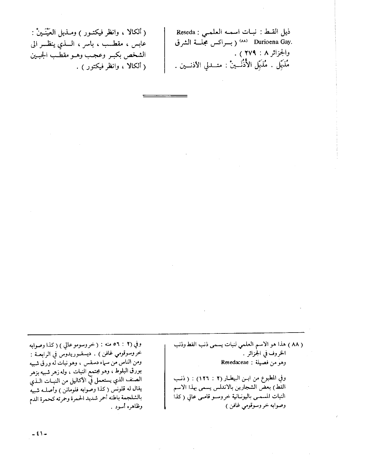ذيل القط: نبات اسمه العلمي Reseda Durioena Gay ( براكس مجلة الشرق والجزائر 8: 279).