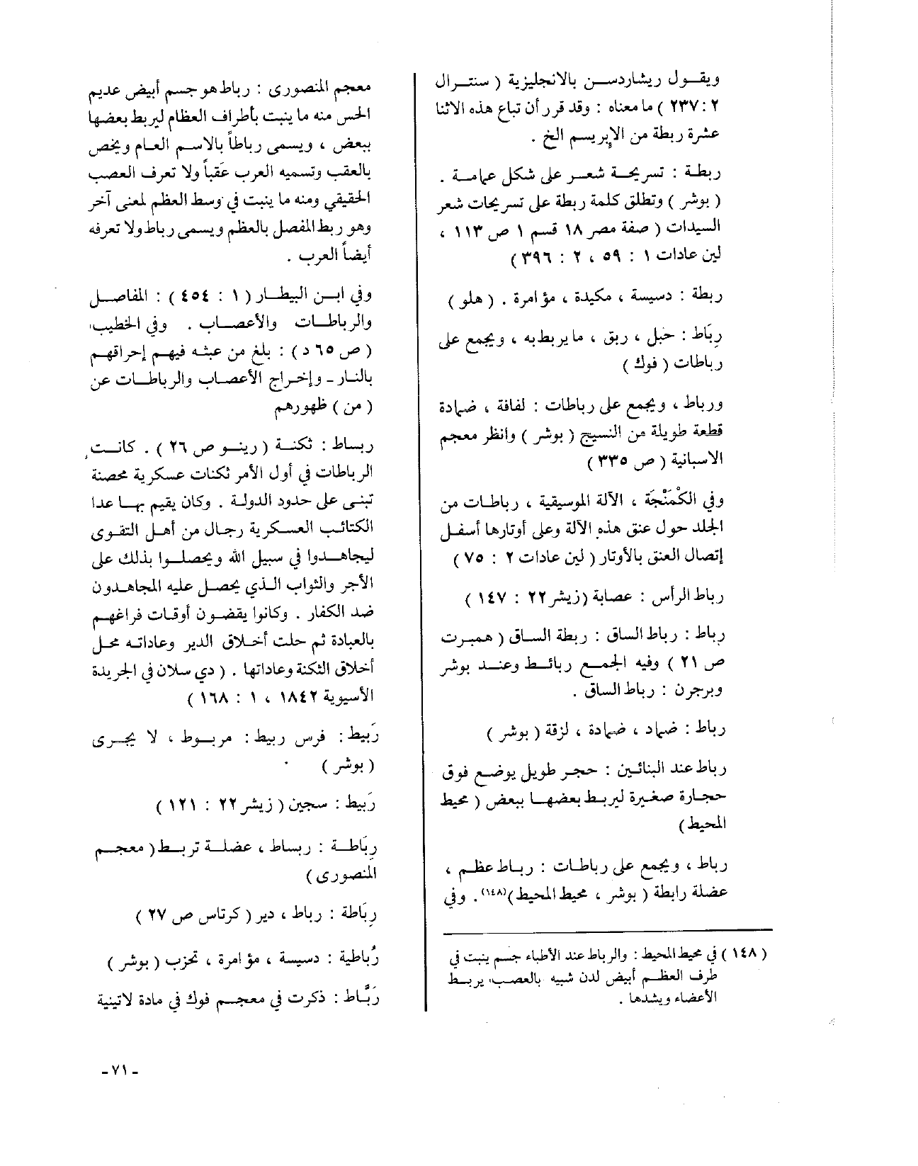 رباط، ويجمع على رباطات: رباط عظم، عضلة رابطة (بوشر، محيط المحيط). وفي معجم المنصوري: رباط هو جسم أبيض عديم الحس منه ما ينبت بأطراف العظام ليربط بعضها ببعض، ويسمى رباطاً بالاسم العام ويخص بالعقب وتسميه العرب عَقباً ولا تعرف العصب الحقيقي ومنه ما ينبت في وسط العظم لمعنى آخر وهو ربط المفصل بالعظم ويسمى رباط ولا تعرفه العرب أيضاً.