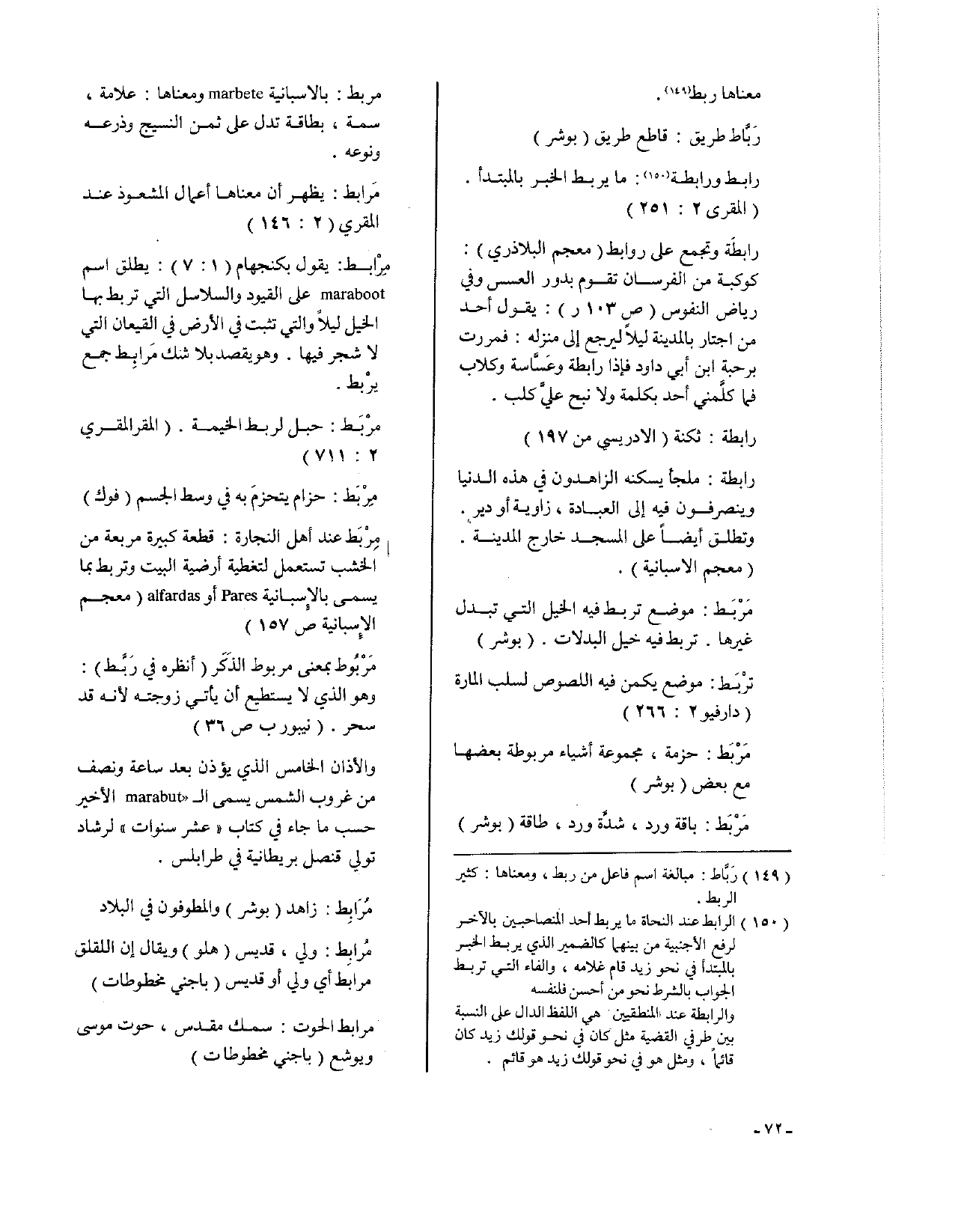 مِرْابط: يقول بكنجهام (1: 7): يطلق اسم maraboot على القيود والسلاسل التي تربط بها الخيل ليلاً والتي تثبت في الأرض في القيعان التي لا شجر فيها. وهو يقصد بلا شك مَرابِط جمع يرْبط.
