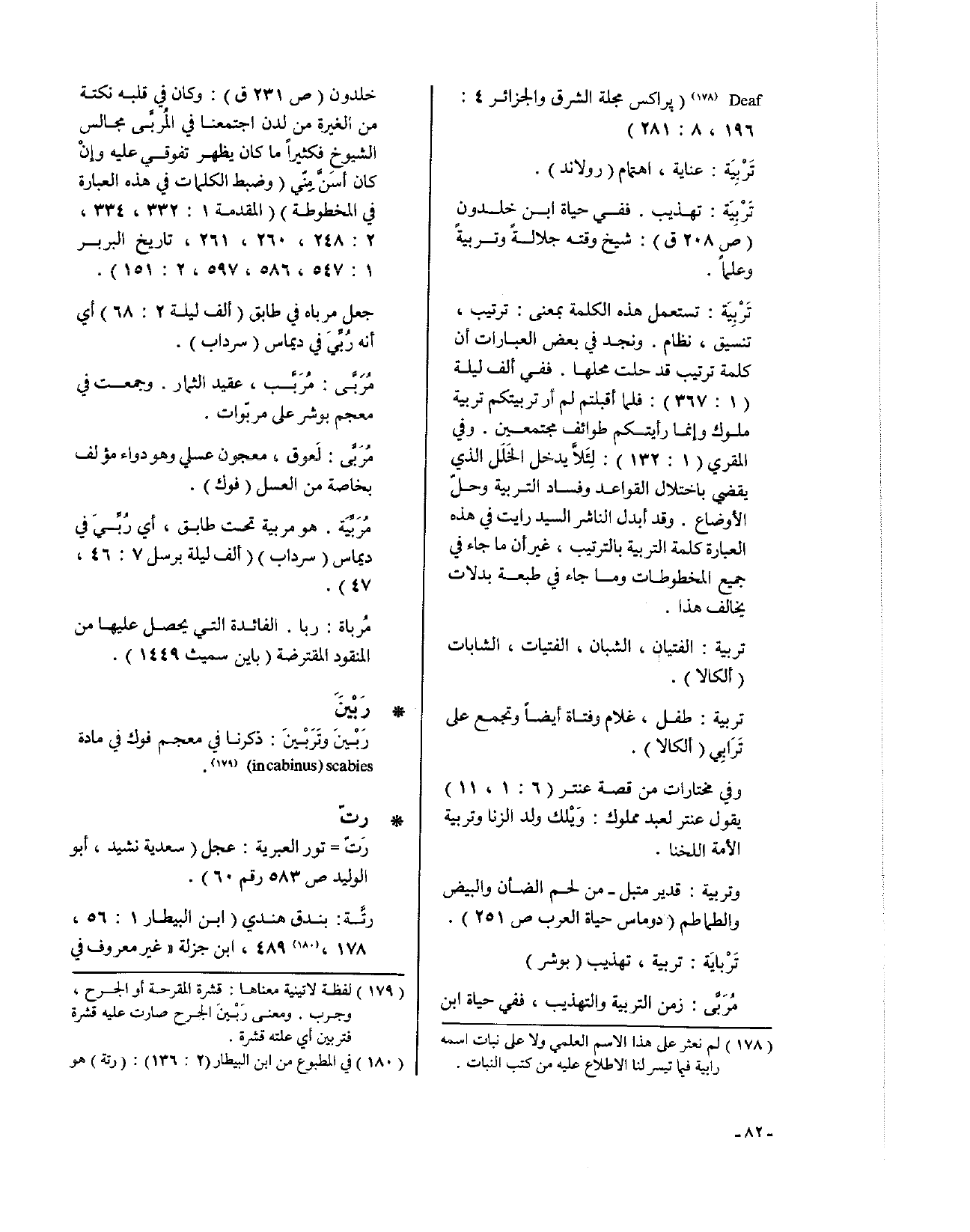 مُرَبَّى: زمن التربية والتهذيب، ففي حياة ابن خلدون (ص231 ق): وكان في قلبه نكتة من الغيرة من لدن اجتمعنا في المُربَّى مجالس الشيوخ فكثيراً ما كان يظهر تفوقي عليه وإنْ كان أسَنَّ مِنّي (وضبط الكلمات في هذه العبارة في المخطوطة) (المقدمة 1: 332، 334، 2: 248، 260، 261، تاريخ البربر 1: 547، 586، 597، 2: 151).
