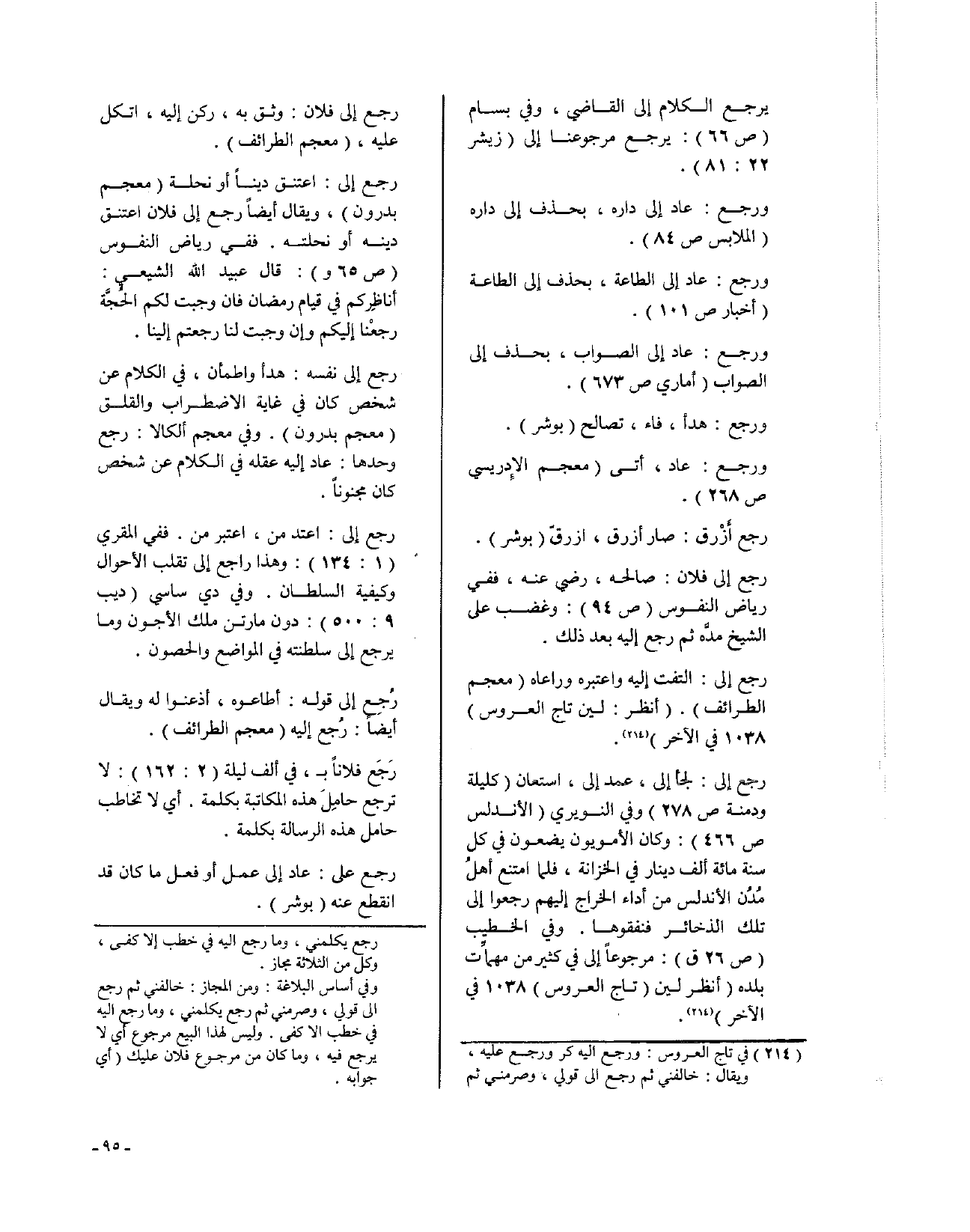 رجع إلى: لجأ إلى،، عمد إلى، استعان (كليلة ودمنة ص278) وفي النويري (الأندلس ص466): وكان الأمويون يضعون في كل سنة مائة ألف دينار في الخزانة، فلما امتنع أهلُ مُدُن الأندلس من أداء الخراج إليهم رجعوا إلى تلك الذخائر فنفقوها. وفي الخطيب (ص26 ق): مرجوعاً إلى في كثير من مهماِّت بلده (انظر لين (تاج العروس) 1038 في الآخر).