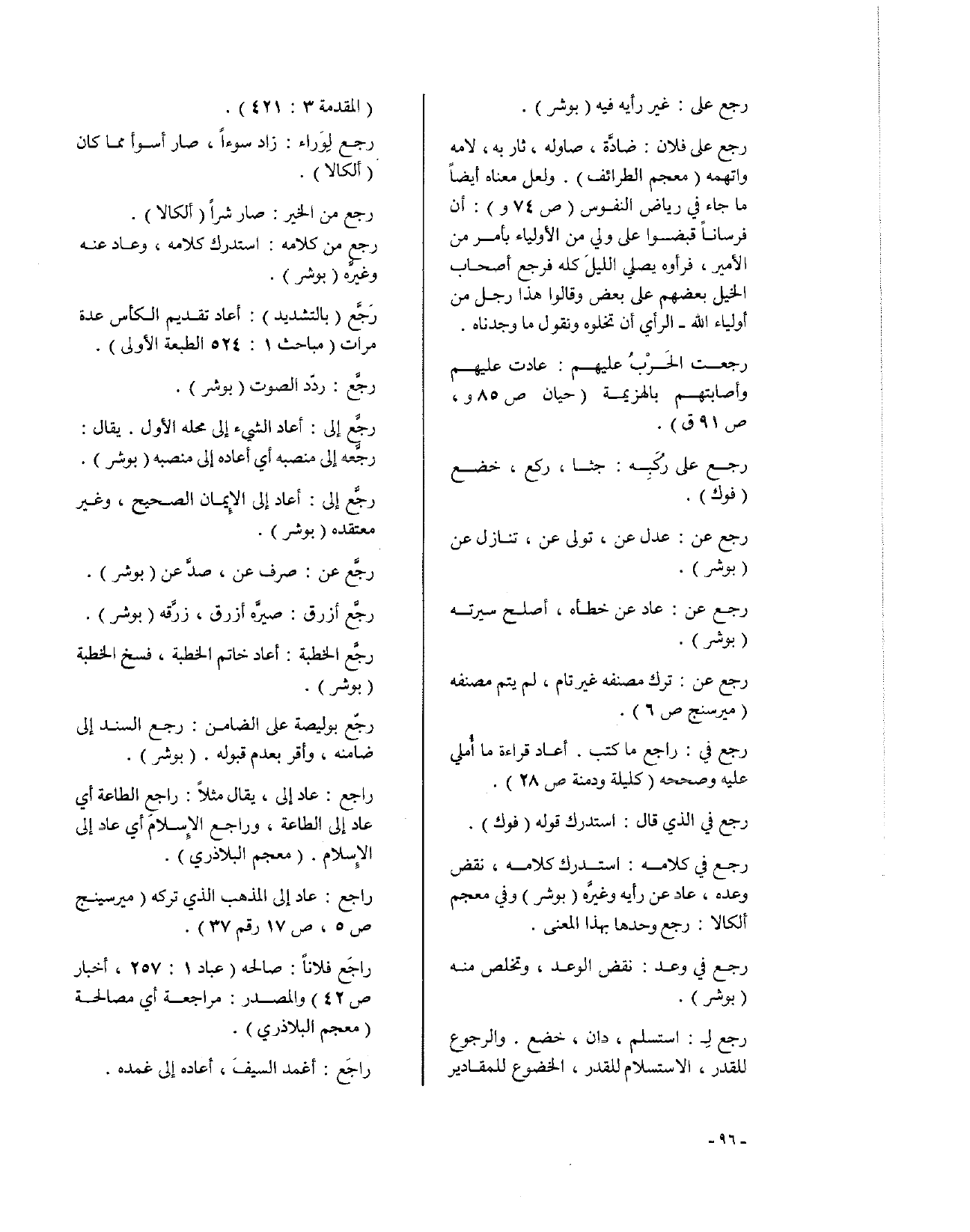 رجع لِ: استسلم، دان، خضع. والرجوع للقدر: الاستسلام للقدر، الخضوع للمقادير (المقدمة 3: 421).