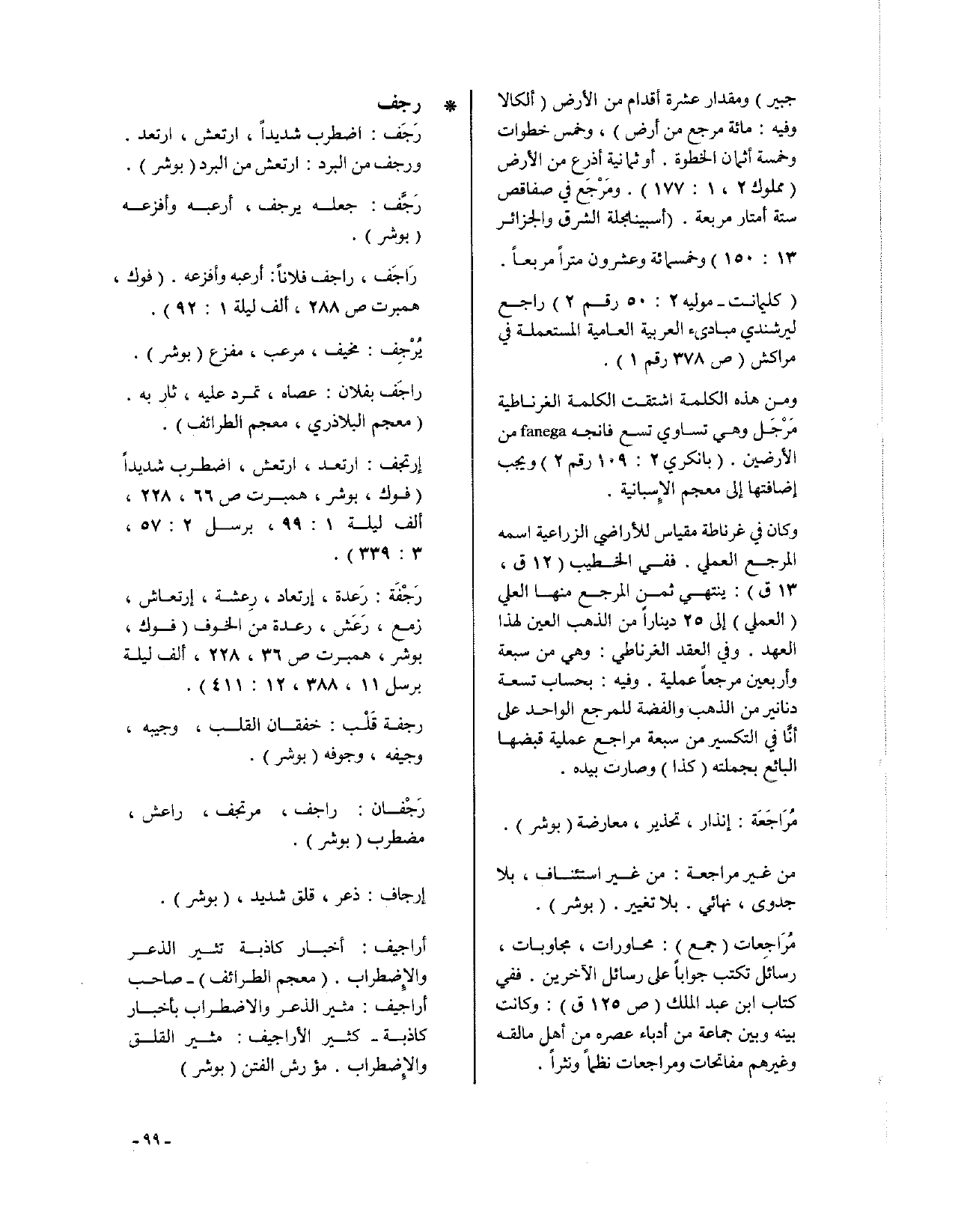 جبير)، ومقدار عشرة أقدام من الأرض (ألكالا وفيه: مائة مرجع من أرض)، وخمس خطوات وخمسة أثمان الخطوة، أو ثمانية أذرع من الأرض (مملوك2، 1: 177). ومَرْجَع في صفاقص ستة أمتار مربعة (أسبينا مجلة الشرق والجزائر 13: 150)، وخمسمائة وعشرون متراً مربعاً (كليمانت - موليه 2: 50 رقم 2)، راجع ليرشندي مبادئ العربية العامية المستعملة في مراكش (ص378 رقم 1).