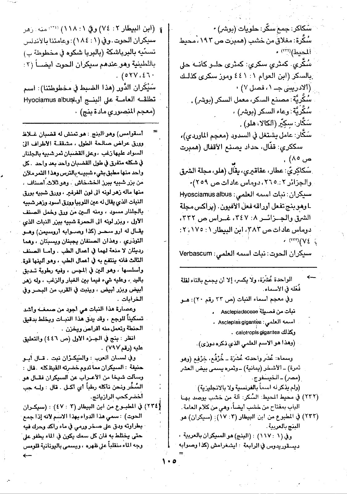 سيكران: نبات اسمه العلمي: Hyosciamus albus L وهو بنج تفعل أوراقه فعل الأفيون. (براكس مجلة الشرق والجزائر 8: 347، غراس ص332، دوماس عادات ص383، ابن البيطار 1: 175، 2: 74).