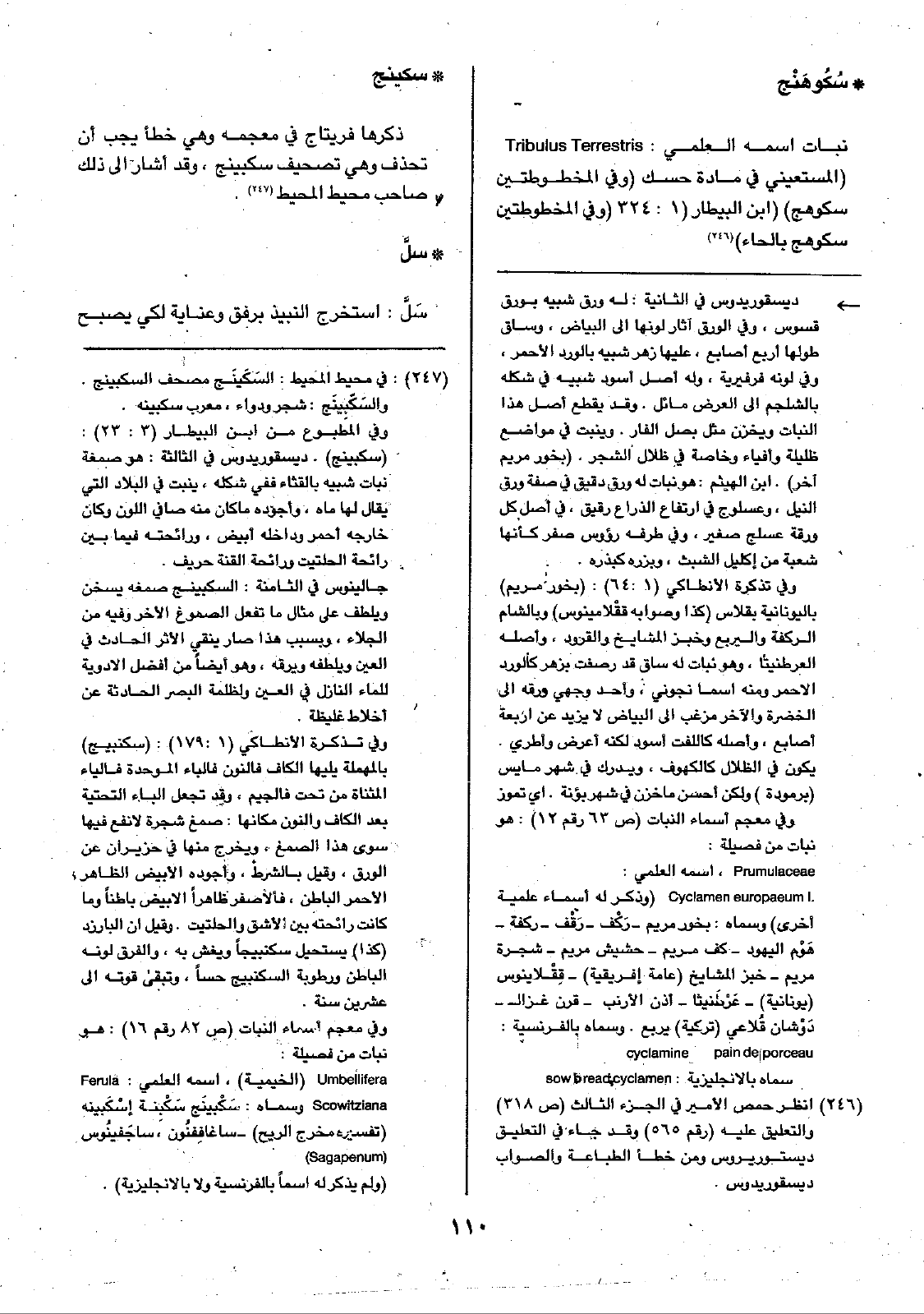 • سُكُوهَنْج: نبات اسمه العلمي: Tribulus Terrestris ( المستعيني في مادة حسك (وفي المخطوطتين سكوهج) (ابن البيطار (1: 324 (وفي المخطوطتين سكوهج بالحاء)
