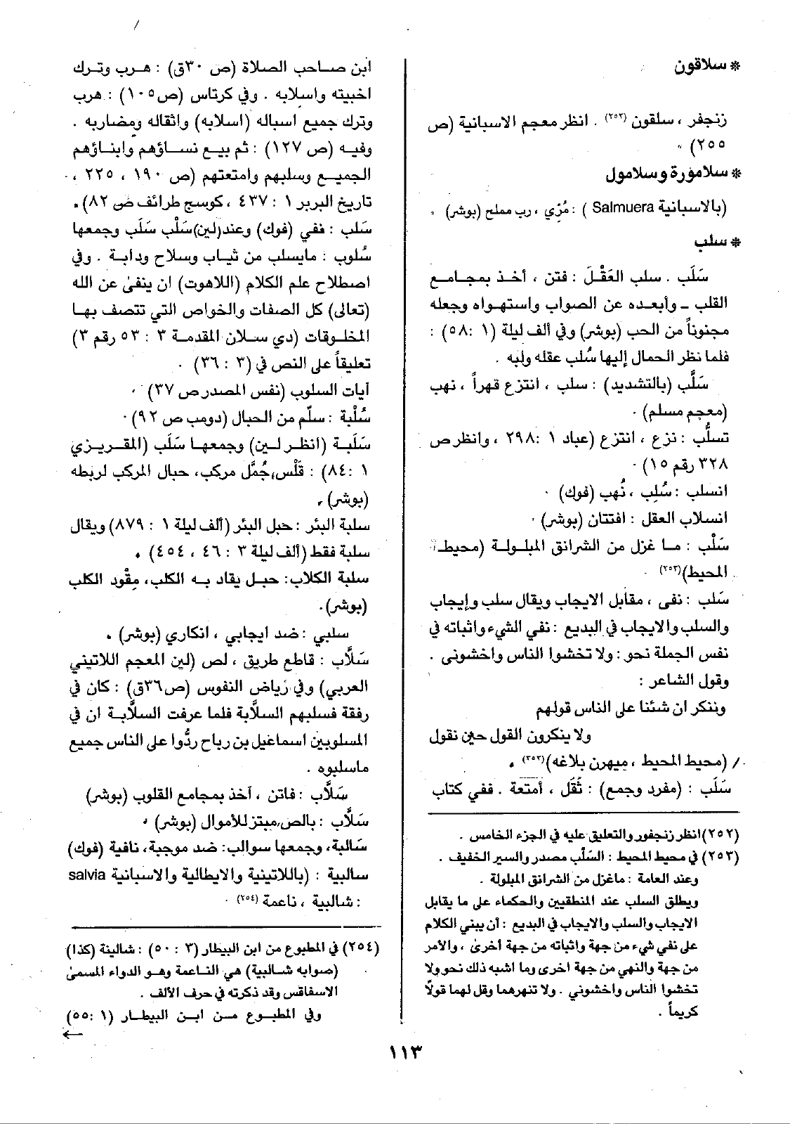 سَلب: ففي (فوك) وعند (لين) سَلْب سَلَب وجمعها سُلوب: ما يسلب من ثياب وسلاح ودابة. وفي اصطلاح علم الكلام (اللاهوت) أن ينفي عن الله (تعالى) كل الصفات والخواص التي تتصف بها المخلوقات (دي سلان المقدمة 3: 53 رقم3) تعليقاً على النص قس (3: 36).