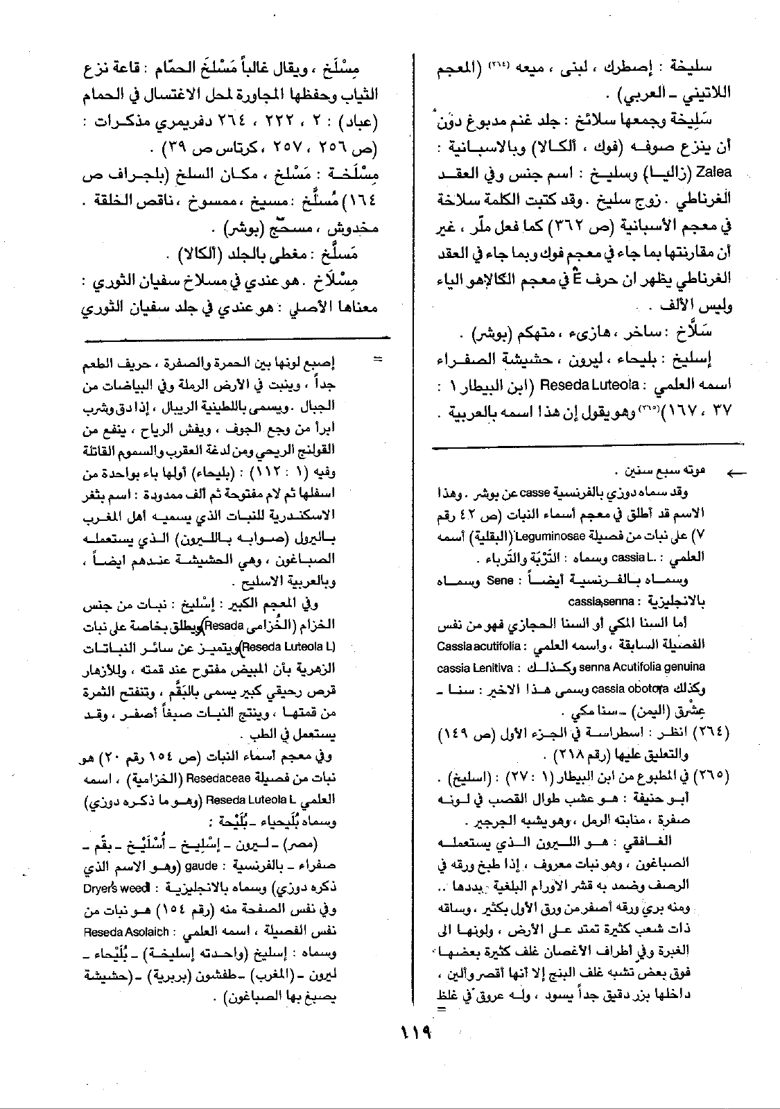 إسليخ: بليحاء، ليرون، حشيشة الصفراء اسمه العلمي: Reseda Luteola ( ابن البيطار 1: 37، 167) وهو يقول إن هذا اسمه بالعربية.