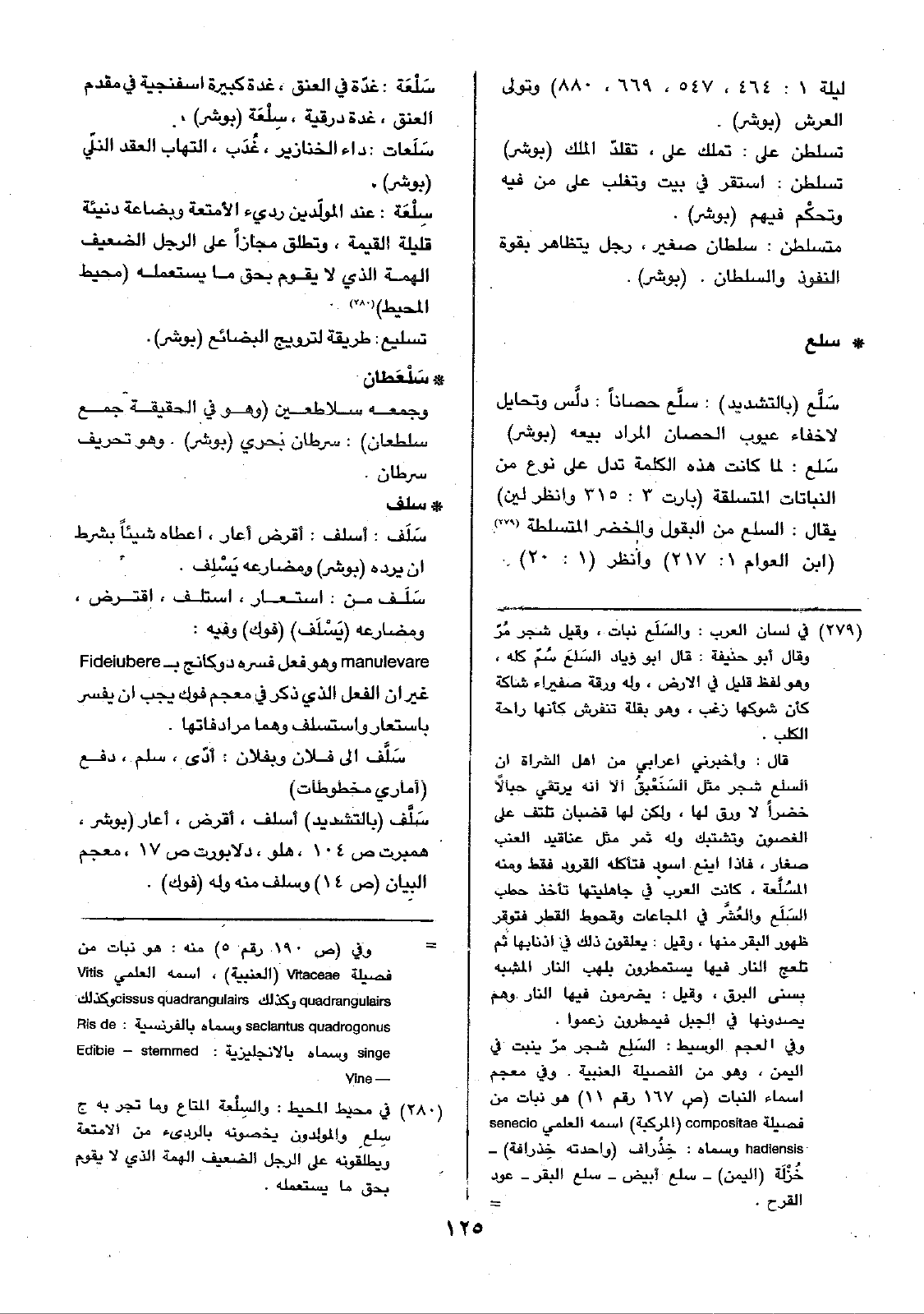 سَلَّع (بالتشديد): سلَّع حصاناً: دلَّس وتحايل لإخفاء عيوب الحصان المراد بيعه (بوشر) سَلع: لما كانت هذه الكلمة تدل على نوع من النباتات المتسلقة (بارت 3: 315 وانظر لين) يقال: السلع من البقول والخضر المتسلطة (ابن العوام 1: 217) وانظر (1: 20).