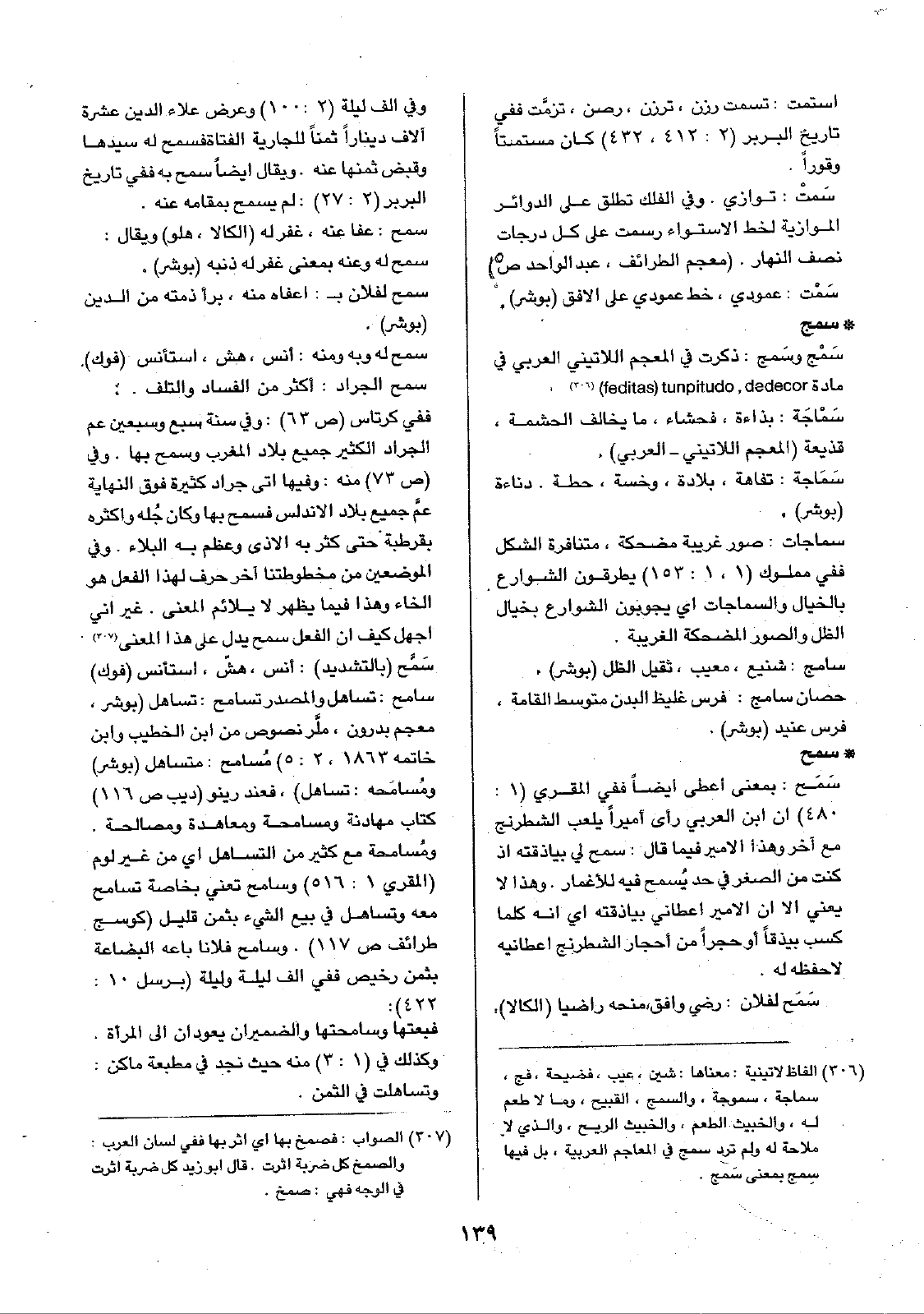 ففي كرتاس (ص63): وفي سنة سبع وسبعين عم الجراد الكثير جميع بلاد المغرب وسمح بها. وفي (ص73) منه: وفيها أتى جراد كثيرة فوق النهاية عمَّ جميع بلاد الأندلس فسمح بها وكان جُله وأكثره بقرطبة حتى كثر به الأذى وعظم به البلاء. وفي الموضعين من مخطوطتنا آخر حرف لهذا الفعل هو الخاء وهذا فيما يظهر لا يلائم المعنى. غير أني أجهل كيف أن الفعل سمح يدل على هذا المعنى سَمَّح (بالتشديد): أنس، هشّ، استأنس (فوك) سامح: تساهل والمصدر تسامح: تساهل (بوشر، معجم بدرون، ملَّر نصوص من ابن الخطيب وابن خاتمه 1863، 2: 5) مُسامح: متساهل (بوشر) ومُسامَحه: تساهل)، فعند رينو (ديب ص116) كتاب مهادنة ومسامحة ومعاهدة ومصالحة. ومُسامحة مع كثير من التساهل أي من غير لوم (المقري 1: 516) وسامح تعني بخاصة تسامح معه وتساهل في بيع الشيء بثمن قليل (كوسج طرائف ص117). وسامح فلانا باعه البضاعة بثمن رخيص ففي ألف ليلة وليلة (برسل 10: 422): فبعتها وسامحتها والضميران يعودان إلى المرأة. وكذلك في (1: 3) منه حيث نجد في مطبعة ماكن: وتساهلت في الثمن.