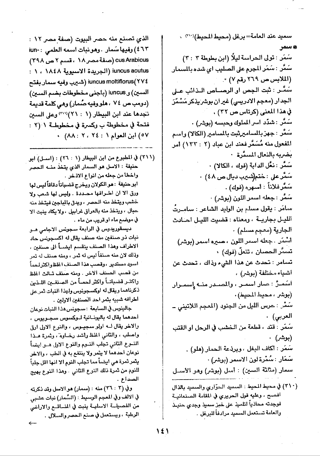 سمار (مثلثة السين): أسل (بوشر) وهو الأسل الذي تصنع منه حصر البيوت (صفة مصر 12: 463) وفيها سَمار. وهو نبات اسمه العلمي: iuncus Arabicus ( صفة مصر 18، قسم 2 ص398) iuncus acutus ( الجريدة الآسيوية 1848، 1: 274) iuncus moltiflorus ( شيرب وفيه سمار بفتح السين) و iuncus ( باجني مخطوطات بضم السين) (دومب ص74، هلو وفيه صُمار) وهي كلمة قديمة نجدها عند ابن البيطار (1: 21) وعلى السين فتحة في مخطوطة ب وكسرة في مخطوطة 1 (2: 57) ابن العوام 1: 24، 2: 88).