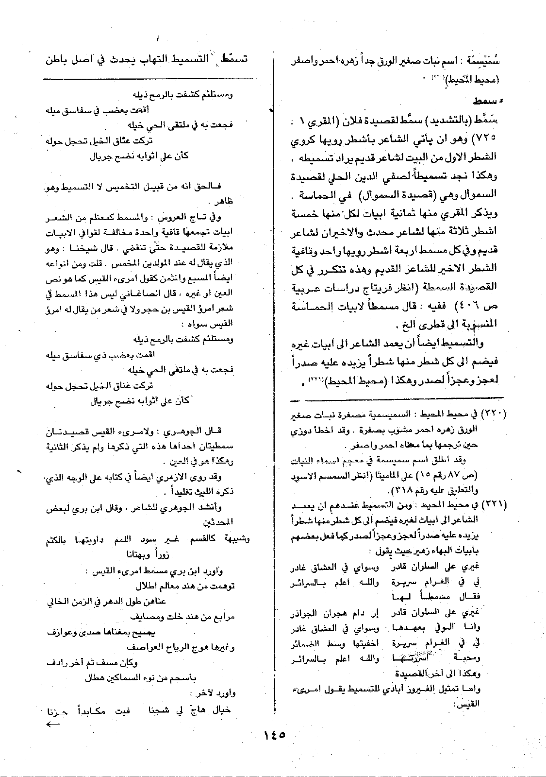 • سمط: سَمَّط (بالتشديد) سمَّط لقصيدة فلان (المقري 1: 725) وهو أن يأتي الشاعر بأشطر رويها كروي الشطر الأول من البيت لشاعر قديم يراد تسميطه، وهكذا نجد تسميطاً لصفي الدين الحلي لقصيدة السموأل وهي (قصيدة السموأل) في الحماسة. ويذكر المقري منها ثمانية أبيات لكل منها خمسة اشطر ثلاثة منها لشاعر محدث والأخيران لشاعر قديم وفي كل مسمط أربعة اشطر رويها واحد وقافية الشطر الأخير للشاعر القديم وهذه تتكرر في كل القصيدة السمطة (انظر فريتاج دراسات عربية ص406) ففيه: قال مسمطاً لأبيات الحماسة المنسوبة إلى قطرى الخ.