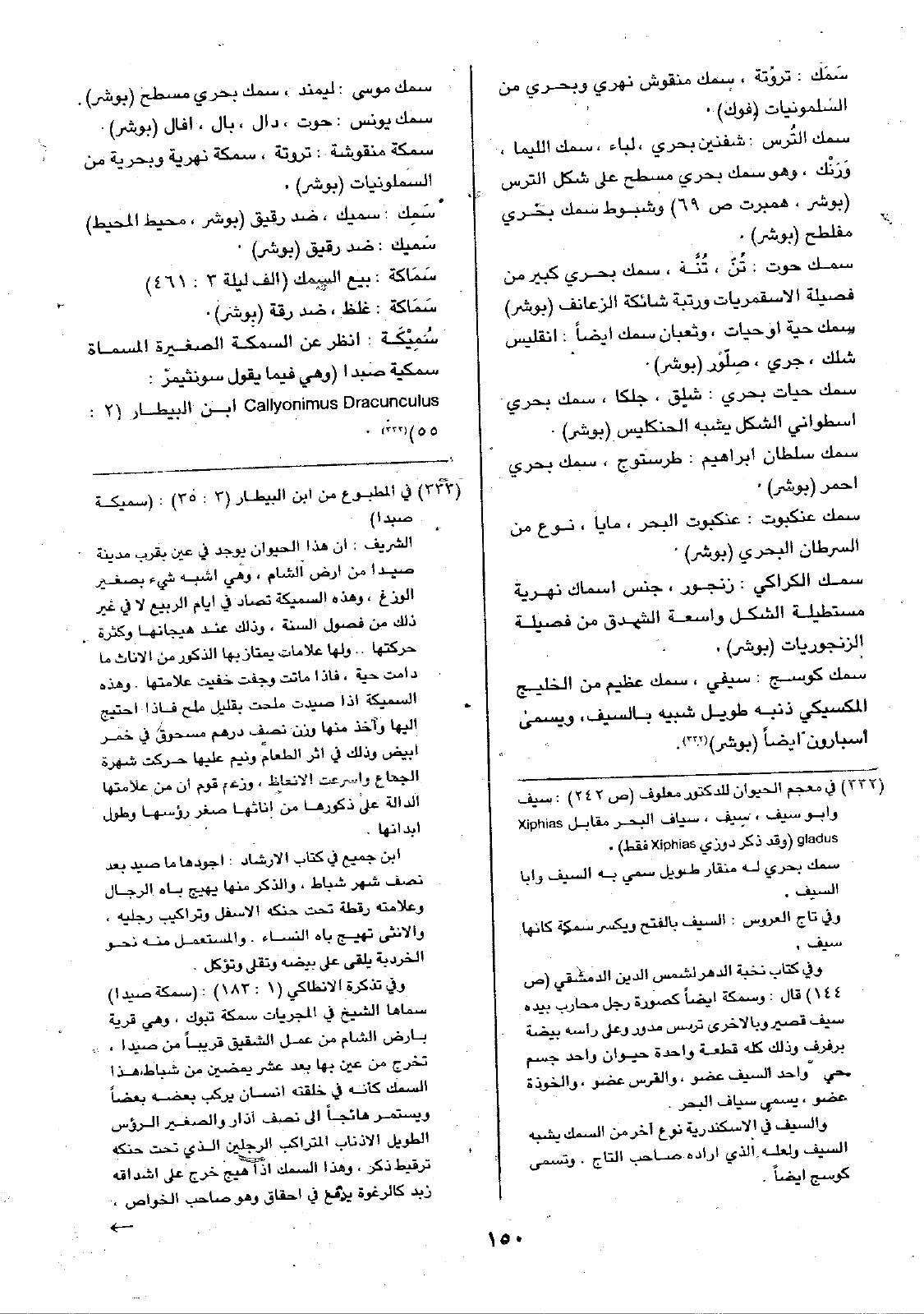 سمك حوت: تُنْ، تُنَّة، سمك بحري كبير من فصيلة الاسقمريات ورتبة شائكة الزعانف (بوشر) سمك حية أو حيات، وثعبان سمك أيضاً: انقليس شلك، جري، صِلّوْر (بوشر).