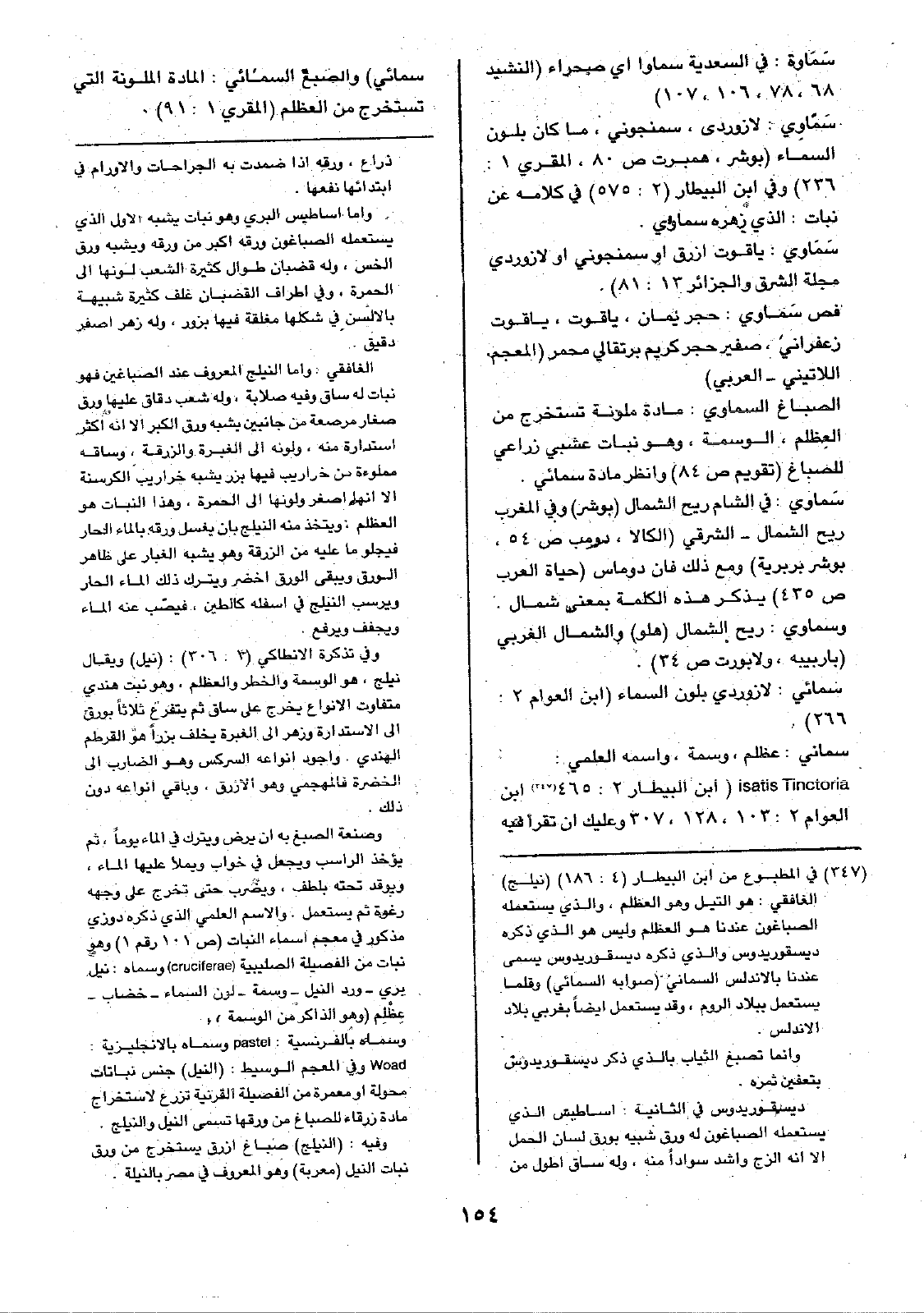 سماني: عظلم، وسمة، واسمه العلمي: isatis Tinctoria ( ابن البيطار 2: 465 ابن العوام 2: 103، 128، 307 وعليك ان تقرأ فيه سمائي) والصبغ السمائي: المادة الملونة التي تستخرج من العظلم (المقري 1: 91).