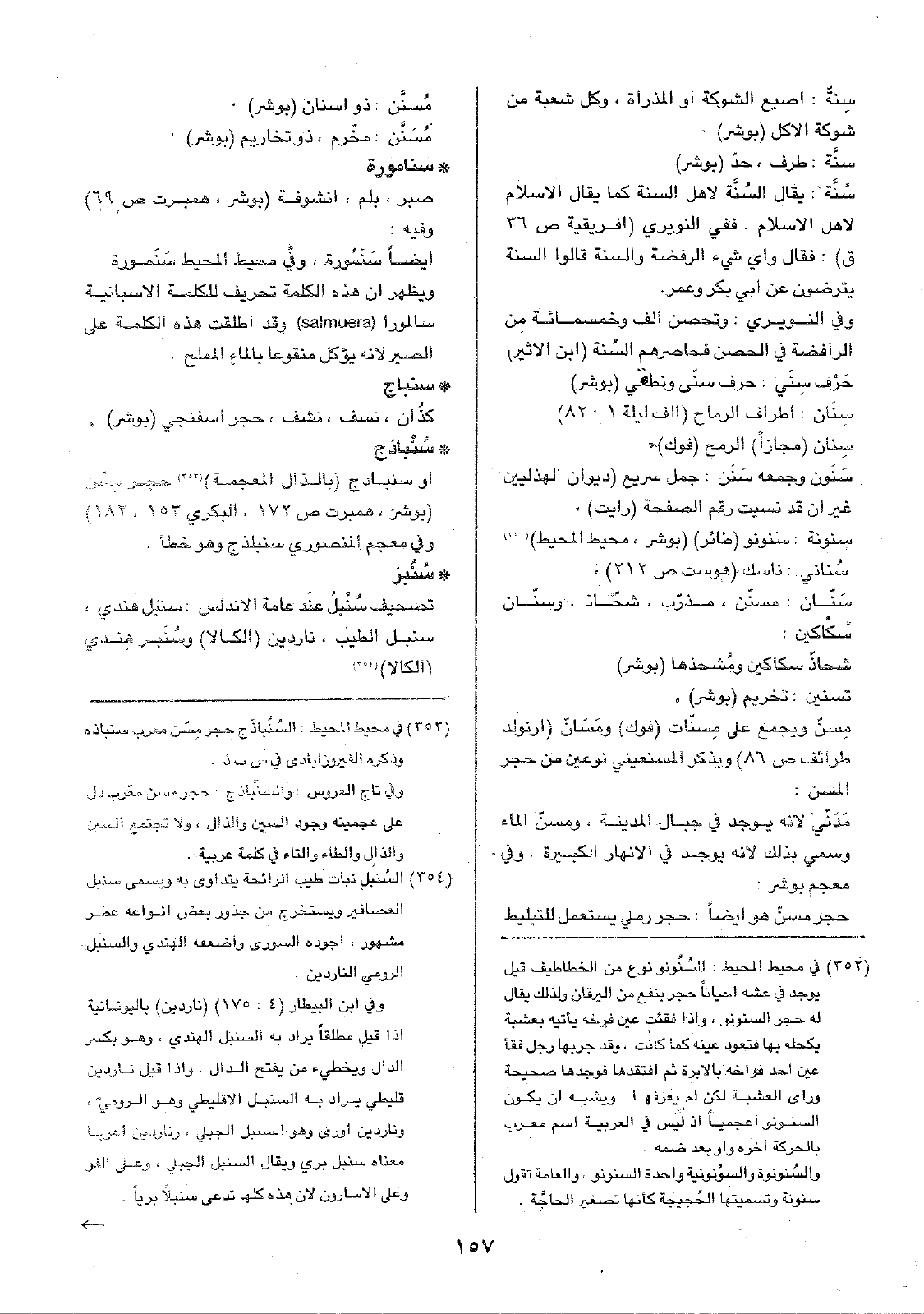 وفي النويري: وتحصن ألف وخمسمائة من الرافضة في الحصن فحاصرهم السُنة (ابن الأثير) حَرْف سِنّي: حرف سنّي ونطقي (بوشر) سِنَان: أطراف الرماح (ألف ليلة 1: 82) سِنان (مجازاً) الرمح (فوك).
