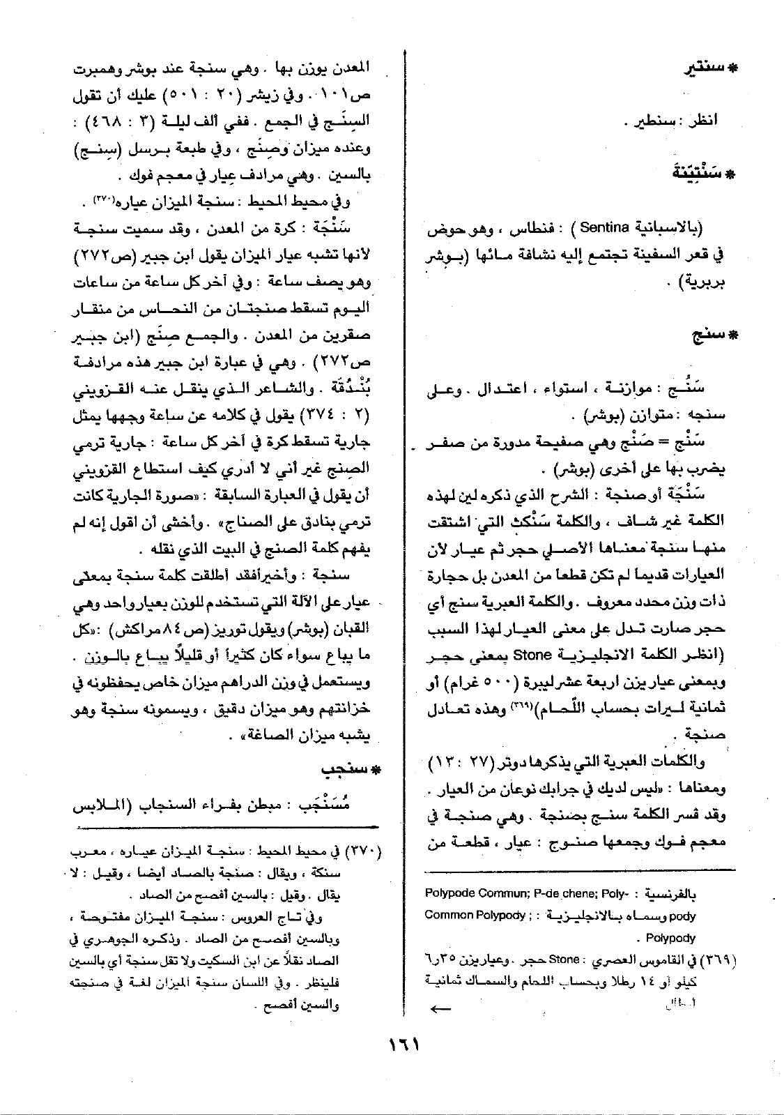 سَنْجَة أو صنجة: الشرح الذي ذكره لين لهذه الكلمة غير شاف، والكلمة سَنْكث التي اشتقت منها سنجة معناها الأصلي حجر ثم عيار لأن العيارات قديماً لم تكن قطعاً من المعدن بل حجارة ذات وزن محدد معروف. والكلمة العبرية سنج أي حجر صارت تدل على معنى العيار لهذا السبب (انظر الكلمة الإنجليزية Stone بمعنى حجر وبمعنى عيار يزن أربعة عشر ليبرة (500 غرام) أو ثمانية ليرات بحساب اللّحام) وهذه تعادل صنجة.