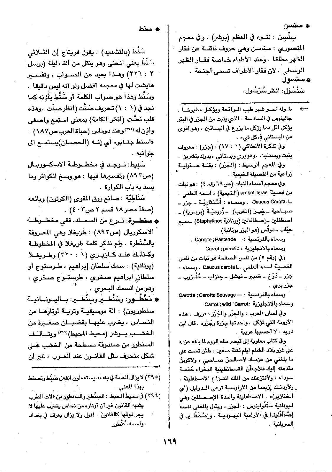 • سنط: سَنَّط (بالتشديد): يقول فريتاج إن الثلاثي سَنْطَ يعني انحنى وهو ينقل من ألف ليلة (برسل 3: 226) وهذا بعيد عن الصواب، وتفسير هابشت لها في معجمه أفضل ولو إنه ليس دقيقاً. وسَنَّط وهذا هو صواب الكلمة أو سَنَّط بأْذِنه كما نجد في (1: 1) تحريف صَنَّت (انظر صنّت، وهذه قلب نصَّت (انظر الكلمة) بمعنى استمع وأصغى وأذِن له وعند دوماس (حياة العرب ص187): ((اسنط جنابو)) أي إنه (الحصان) يستمع إلى جوانبه.