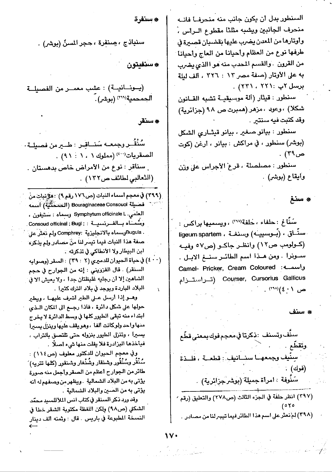 • سنقر: سُنْقُر وجمعه سَناقِر: طير من فصيلة. الصقريات (مملوك 1، 1: 91).
