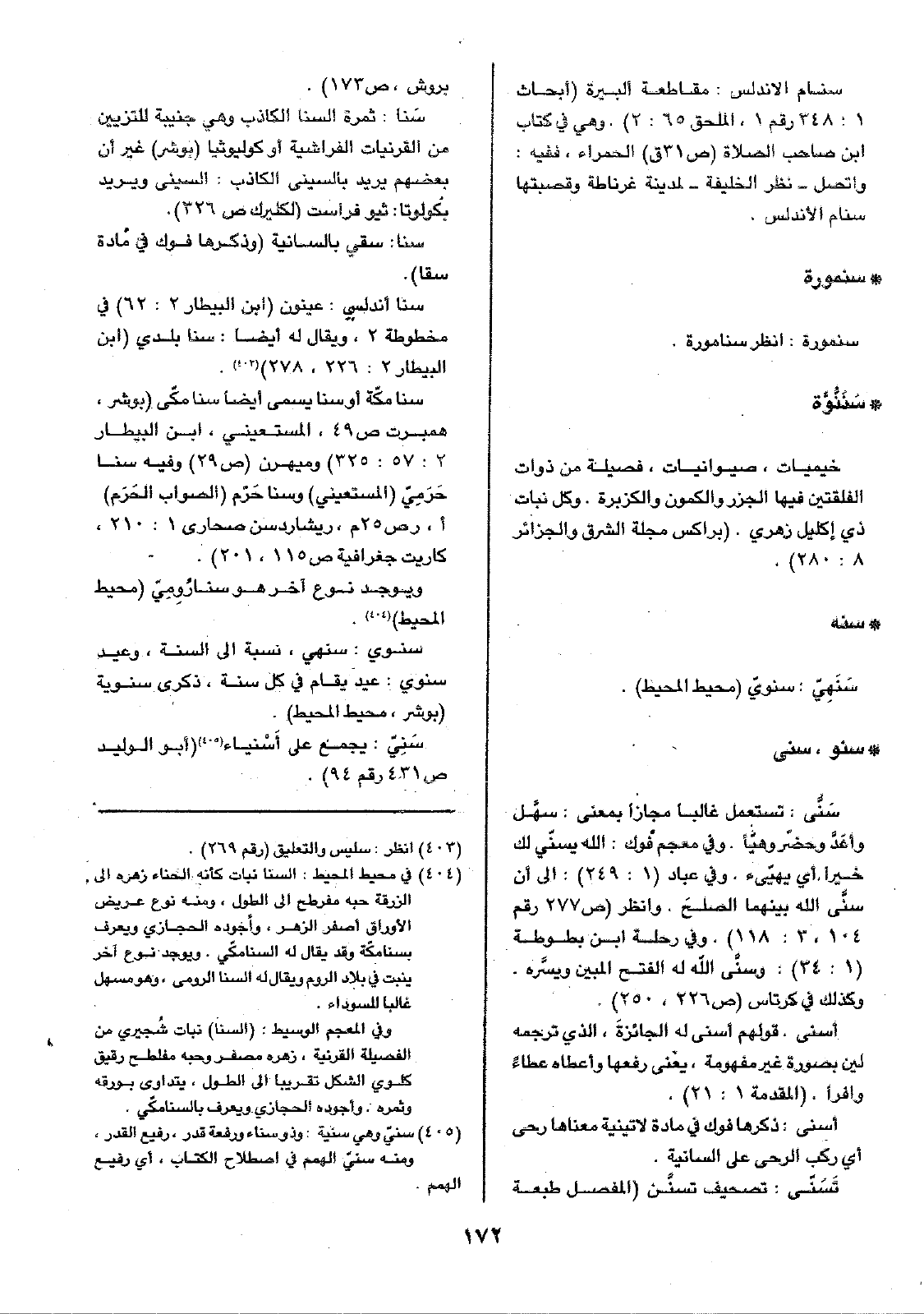 سَنا: ثمرة السنا الكاذب وهي جنيبة للتزيين من القرنيات الفراشية أو كوليوثيا (بوشر) غير أن بعضهم يريد بالسينى الكاذب: السينى ويريد بكولوتا: ثيو فراست (لكليرك ص326).