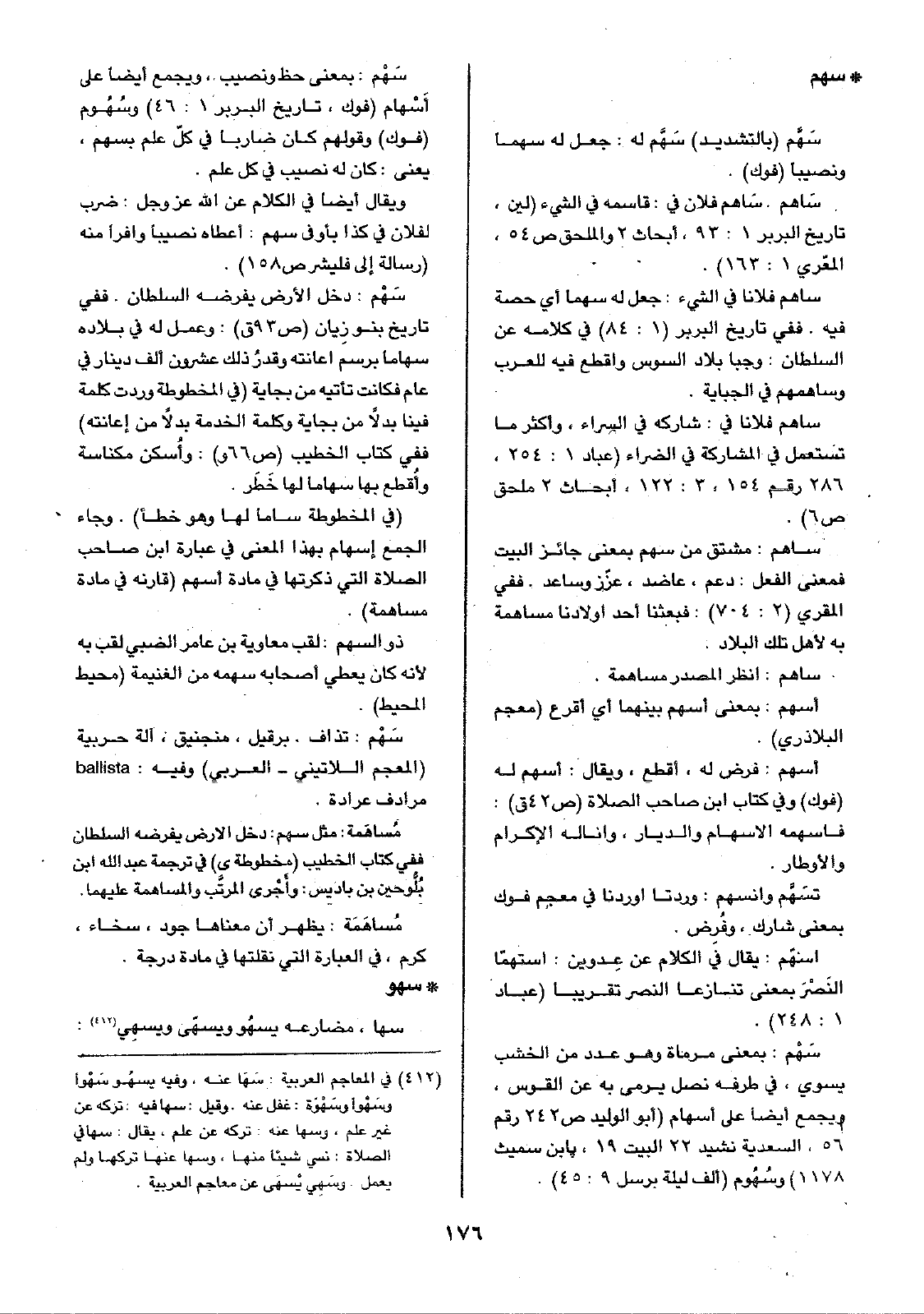 سَهْم: بمعنى حظ ونصيب، ويجمع أيضاً على أَسْهام (فوك، تاريخ البربر 1: 46) وسُهُوم (فوك) وقولهم كان ضارباً في كلّ علم بسهم، يعنى: كان له نصيب في كل علم.