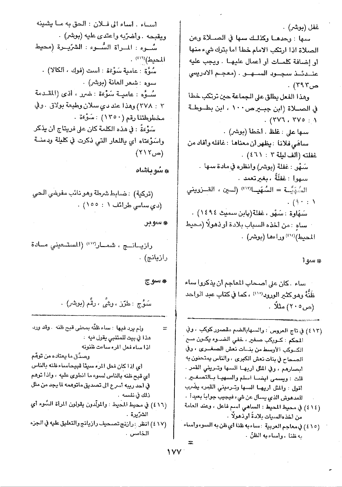 • سوأ: ساء. كان على أصحاب المعاجم أن يذكروا ساء ظَنُّهُ وهو كثير الورود، كما في كتاب عبد الواحد (ص205) مثلاً.