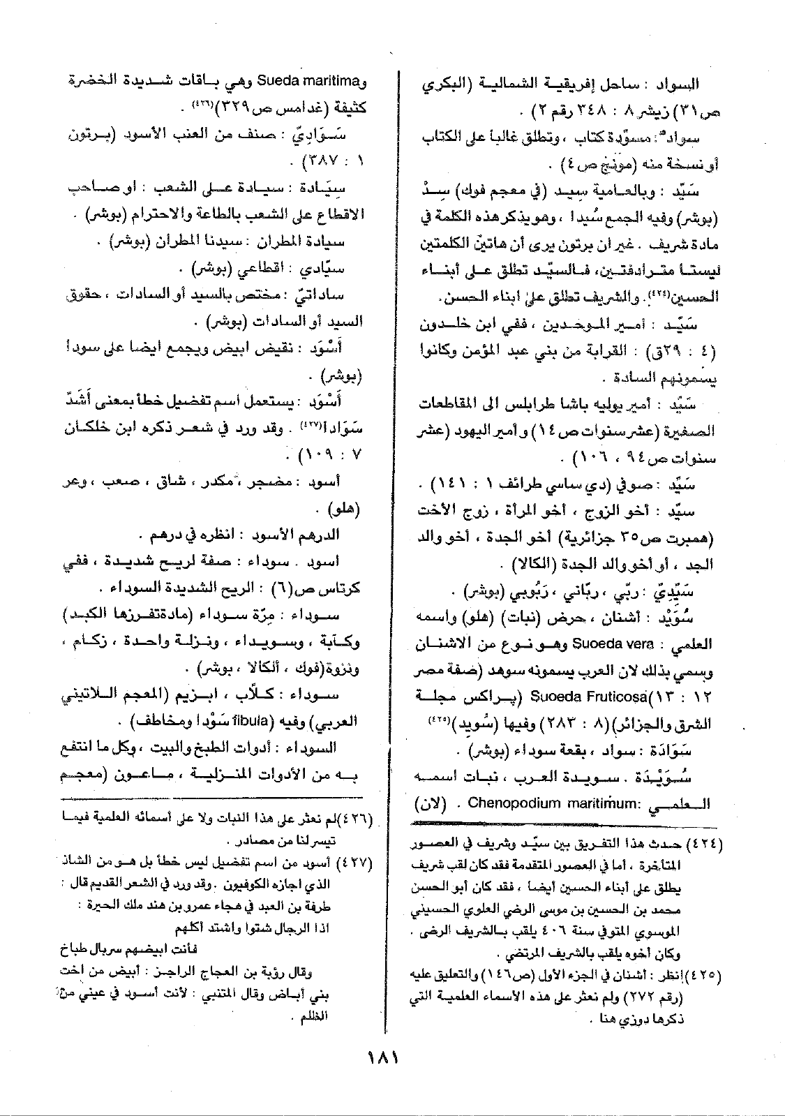 سُوَيْد: أشنان، حرض (نبات) (هلو) واسمه العلمي: Suoeda vera وهو نوع من الاشنان وسمي بذلك لان العرب يسمونه سوهد (صفة مصر 12: 13) Suoeda Fruticosa ( براكس مجلة الشرق والجزائر) (8: 283) وفيها (سُويِد) سَوَادَة: سواد، بقعة سوداء (بوشر).
