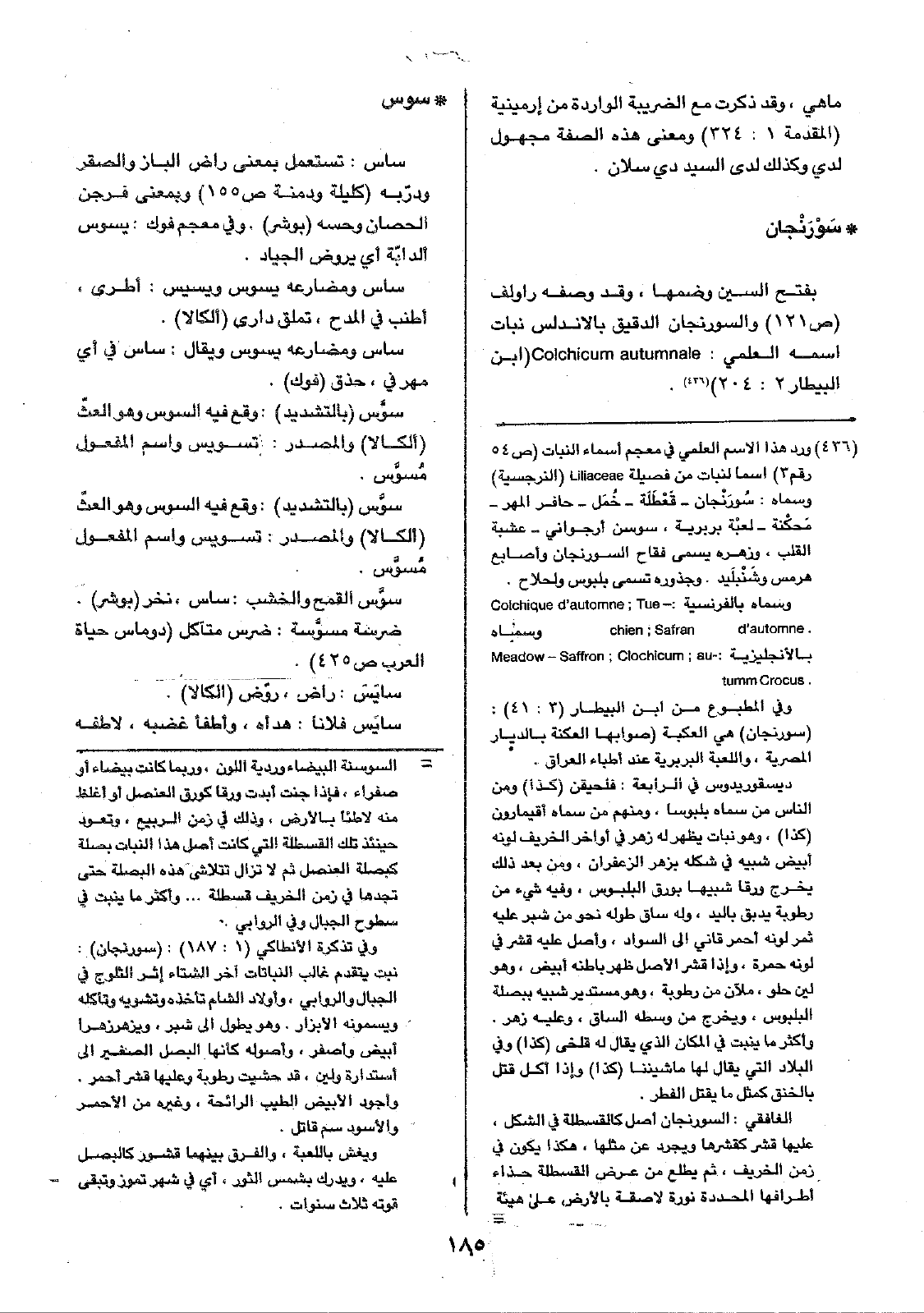 • سَوْرَنْجان: بفتح السين وضمها، وقد وصفه راولف (ص121) والسورنجان الدقيق بالأندلس نبات اسمه العلمي: Colchicum autumnale ( ابن البيطار 2: 204).