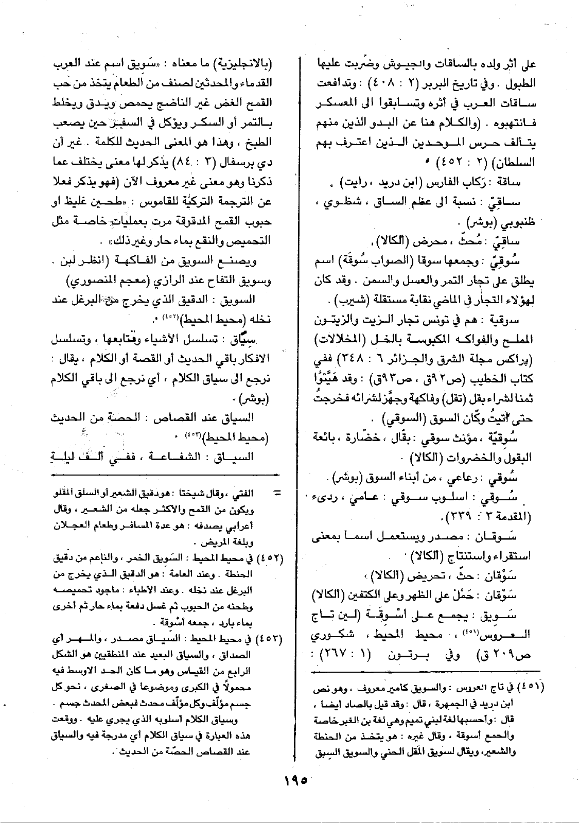 سَوْقان: حَمْل على الظهر وعلى الكتفين (ألكالا) سَوِيق: يجمع على أَسْوِقَة (لين تاج العروس، محيط المحيط، شكوري ص209 ق) وفي برتون (1: 267): (بالإنجليزية) ما معناه: ((سَوِيق اسم عند العرب القدماء والمحدثين لصنف من الطعام يتخذ من حب القمح الغض غير الناضج يحمص ويدق ويخلط بالتمر أو السكر ويؤكل في السفر حين يصعب الطبخ، وهذا هو المعنى الحديث للكلمة. غير أن دي برسفال (3: 84) يذكر لها معنى يختلف عما ذكرنا وهو معنى غير معروف الآن (فهو يذكر فعلا عن الترجمة التركية للقاموس: ((طحين غليظ أو حبوب القمح المدقوقة مرت بعمليات خاصة مثل التحميص والنقع بماء حار وغير ذلك)).