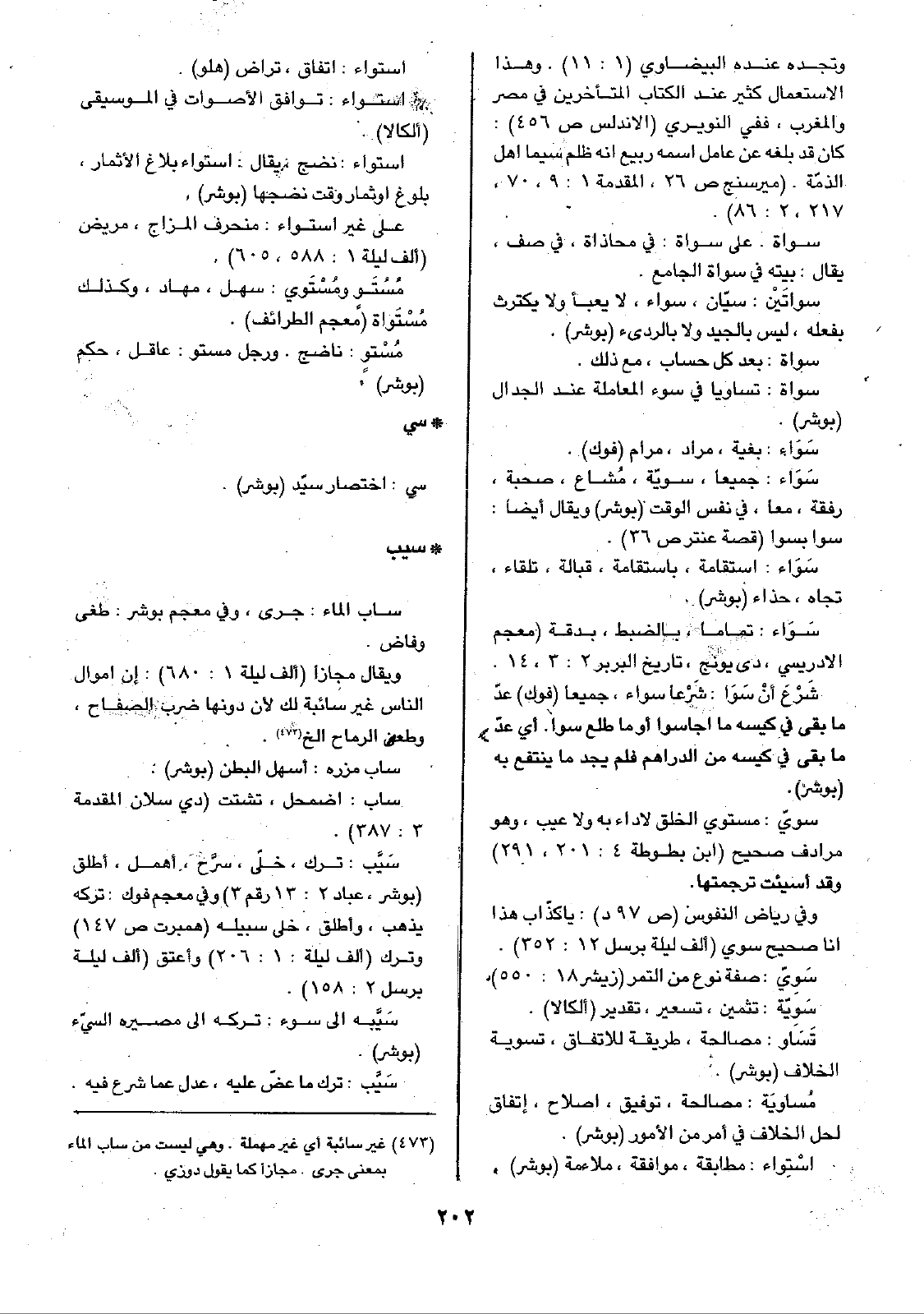 سويّ: مستوي الخلق لا داء به ولا عيب، وهو مرادف صحيح (ابن بطوطة 4: 201، 291) وقد أسيئت ترجمتها.